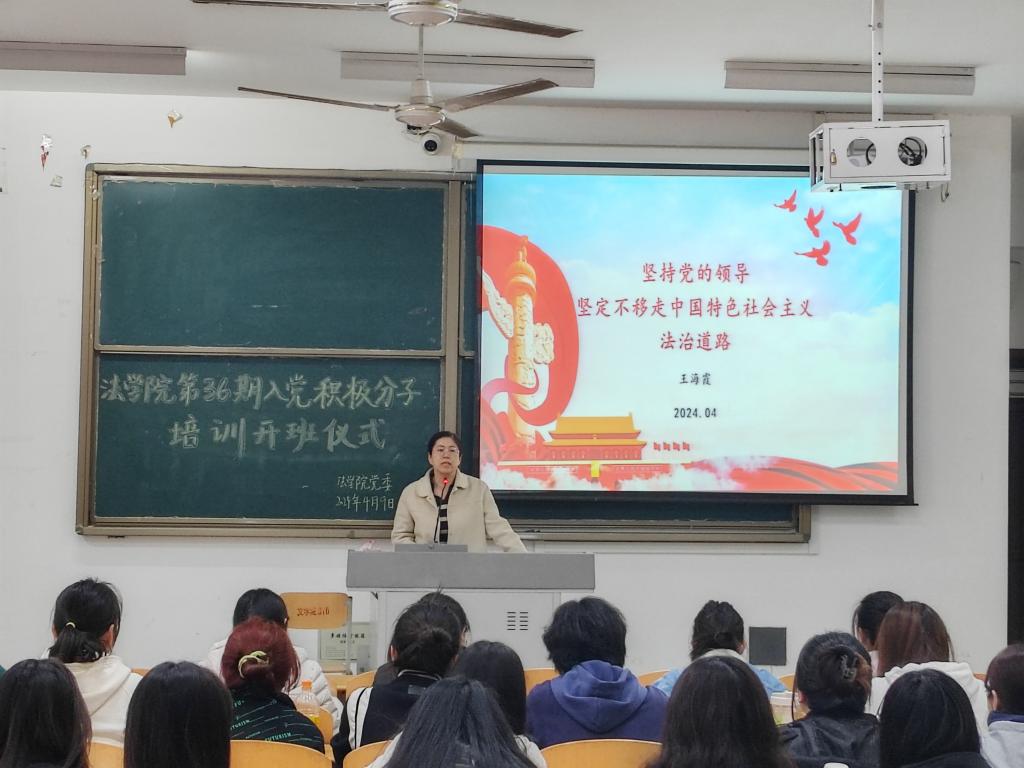 开班仪式后,王海霞副书记主讲了第一堂党课:《坚持党的领导 坚定不移走中国特色社会主义法治道路》。本次党课从“完善以宪法为核心的中国特色社会主义法律体系”、“扎实推进依法行政”、“严格公正司法”、“加强建设法治社会”这四个方面展开,并希望全体学员能够坚持理论联系实际,做到知行合一,积极展现出入党积极分子良好的品行担当和优秀的精神风貌。