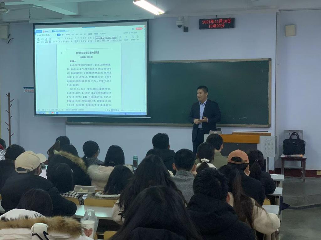 2021年11月10日,北京市京师(德州)律师事务所副主任纪朝辉来bat365中文官方网站讲授《经济法案例研习》课。纪主任结合自己办理结案的真实案例,阐释案情,分析法律适用,与学生分组研讨律师代理策略和办案思路,视角新颖,实务性强,授课方式生动,富有启发性,深受同学们欢迎。