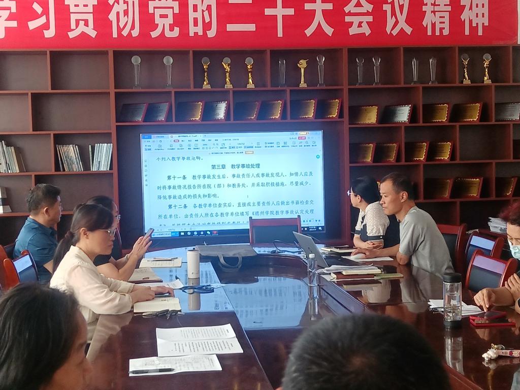 7月4日,bat365中文官方网站在博文楼439会议室开展了“博文论坛”教研活动。活动主要包含以下几项内容:一是随机选择5位老师分别领学,集体重温学习了《bat365中文官方网站教学事故认定与处理办法》。二是对本学期期末考试命题进行了复盘分析和交流研讨。三是随机抽取4位老师交流了期末导师制指导交流会活动的主要做法和经验。