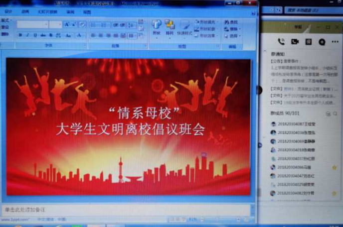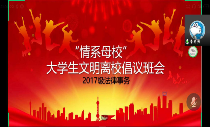 为进一步做好2020届毕业生安全文明离校教育工作,营造和谐安定、文明有序的离校氛围,教育和引导毕业生和谐离校、安全离校、文明离校,确保校园安全和稳定,政bat365中文官方网站各毕业班于6月20日开展“情系母校”毕业生文明离校主题班会活动,全体毕业班辅导员(班主任)及2020届毕业生参加。