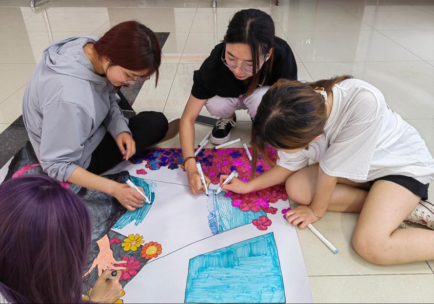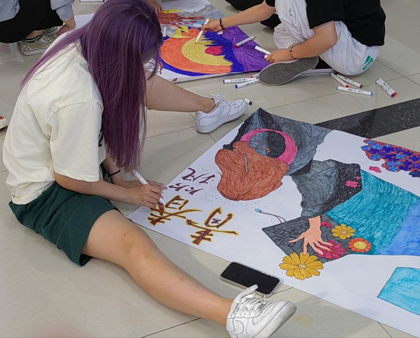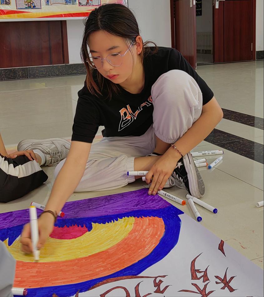 展报绘制过程中,学弟学妹们分工明确,合作默契,设计、绘画、上色用心有爱,五彩的颜料、流畅的勾勒,展现出对学长学姐浓浓的眷恋不舍之情。一句句真诚的微话祝福跃然贴纸,纸短情长,表达出对学长学姐最热烈的祝贺和最诚挚的祝福,为正值毕业季的大学校园增添了友谊长存、放心去飞的绚烂色彩。