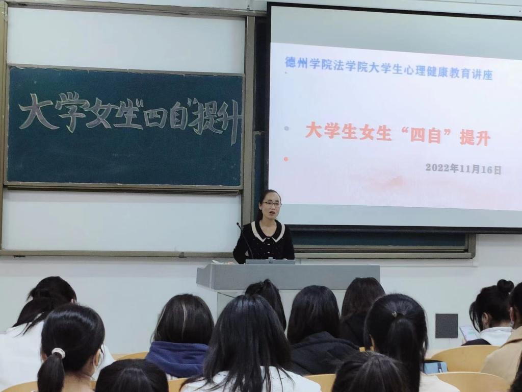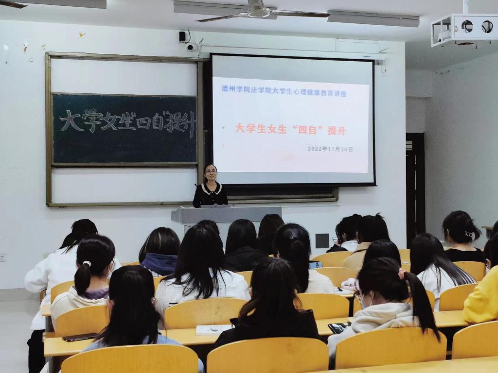 为增强大学女生心理建设,培养女生自尊、自信、自立、自强的精神品质。2022年11月16日下午4:00,bat365中文官方网站在博文楼0427教室举行大学女生“四自”提升心理健康教育讲座,2022级全体女生聆听了讲座。