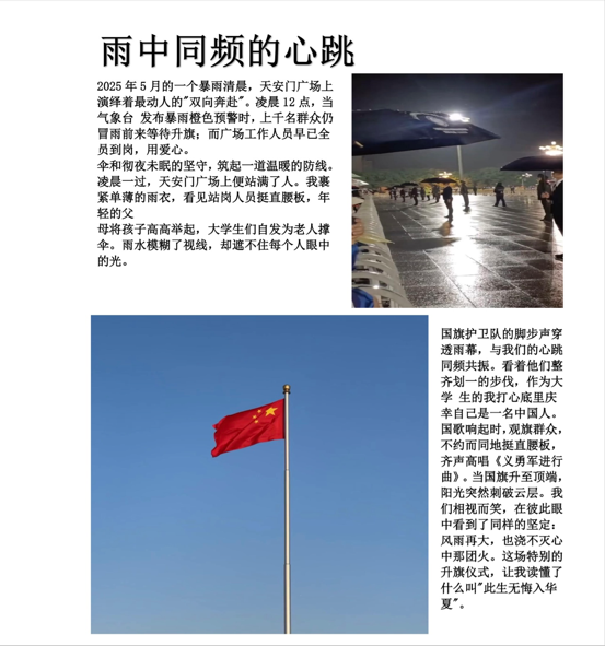 活动期间,同学们纷纷化身为敏锐的“生活记录者”,紧扣大赛主题,用镜头捕捉校园内外的温暖画面。作品题材丰富多元,有的作品聚焦公益活动,记录为老人普法的有爱瞬间;有的定格校园篮球赛,捕捉球员们拼搏的姿态,传递出竞技体育的魅力与青春活力;还有作品展现天安门广场暴雨中人们冒雨等待升旗,以及国旗护卫队坚定步伐的画面,彰显了人们对祖国深沉的爱和强烈的民族自豪感。每一幅作品都生动展现了法学与公共管理学院学子对生活的热爱、对真善美的追求,传递出积极向上的精神风貌。