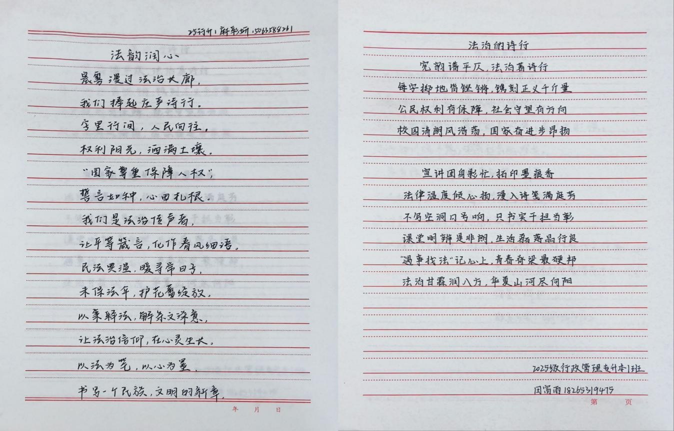 为深入贯彻落实全面依法治国战略,充分发挥bat365官网宪法法律宣讲团的专业优势与传播效能,引导全体法学与公共管理学院学生形成办事依法、遇事找法、化解矛盾靠法的行为自觉,法学与公共管理学院于2025年11月5日至11月15日成功开展了“宪韵成文,诗颂法治”诗歌书写活动。