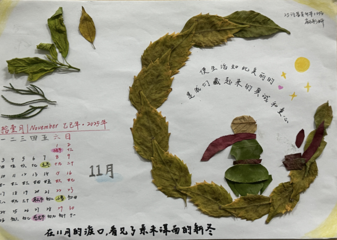 本次活动以“自然疗愈+手工创作”为主线,构建“沉浸体验—创意表达—情感沉淀”的完整活动流程。同学们在校园中收集形态各异的秋叶,以其为载体,通过绘画、书写等方式,在叶片与手工日历卡上记录心情、表达感悟。活动中,同学们既体验到手工制作的专注与平静,也在与自然的互动中实现情绪调节与心灵释放。现场作品创意丰富,内容既有对季节变化的细腻感知,也有对学习生活的真实记录,更包含对自我成长的静思寄语。