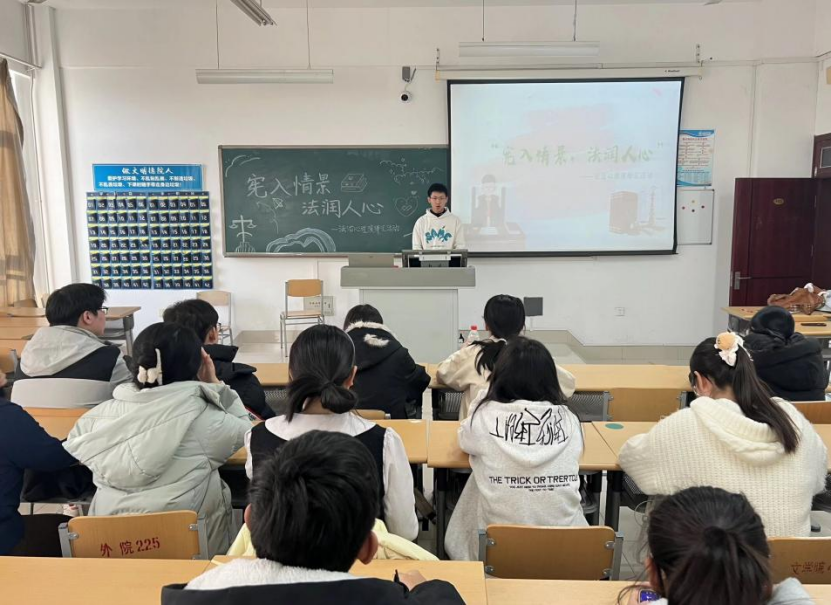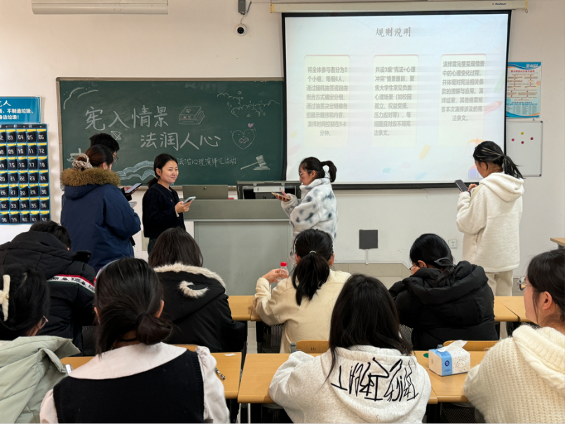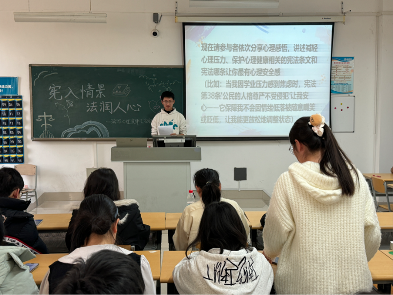 为深化宪法认知、强化心理认同,疏导大学生心理困惑、传递法治温度、构建和谐校园,法学与公共管理学院于2025年11月30日在博文楼421教室开展了“宪入情景,法润人心”法治心理演绎汇活动。