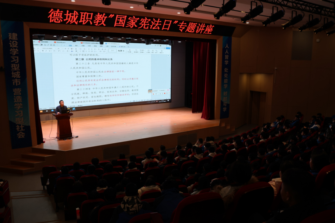 宣讲活动由德州市总工会、德州市司法局、德州市教育局、德州市律师协会主办,德城区总工会、德城区司法局、德城职教承办。德州市相关部门负责同志、德城职教师生共400余人参加宣讲活动。