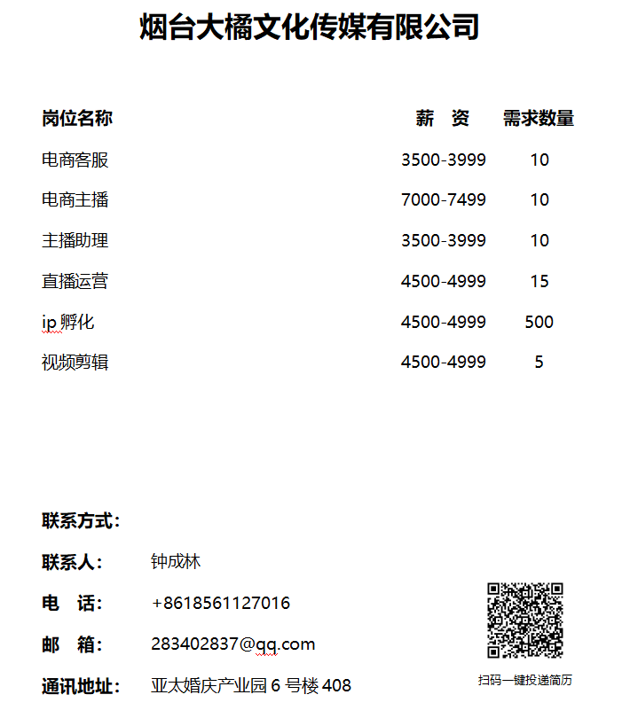 招聘信息|烟台大橘文化传媒有限公司