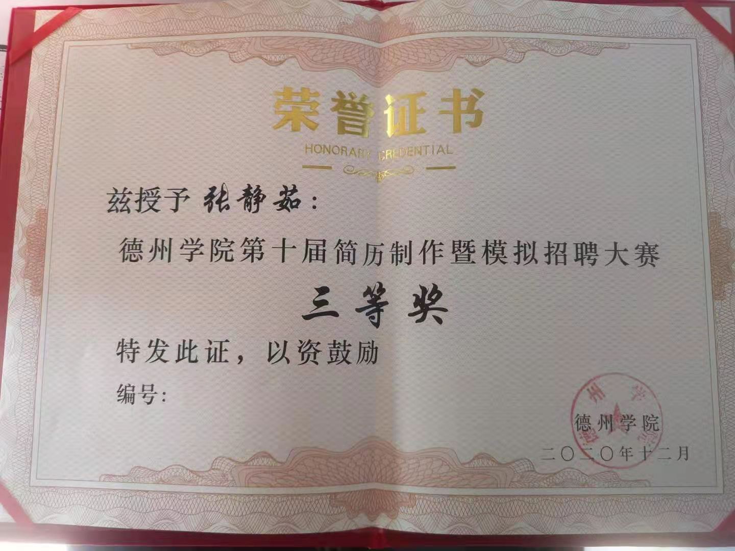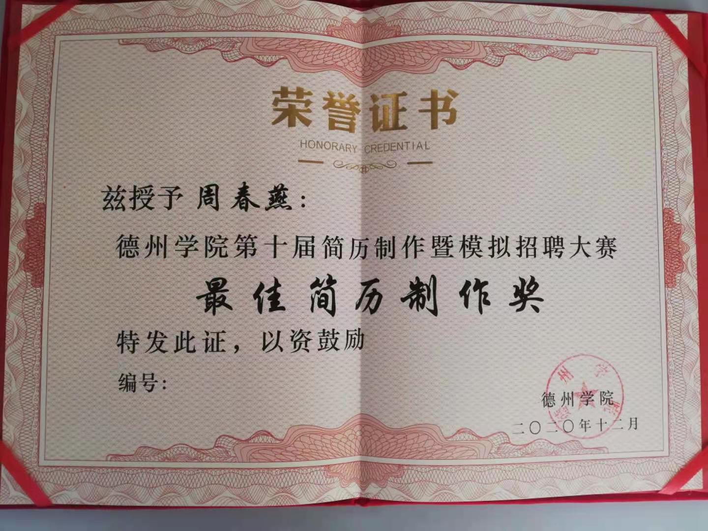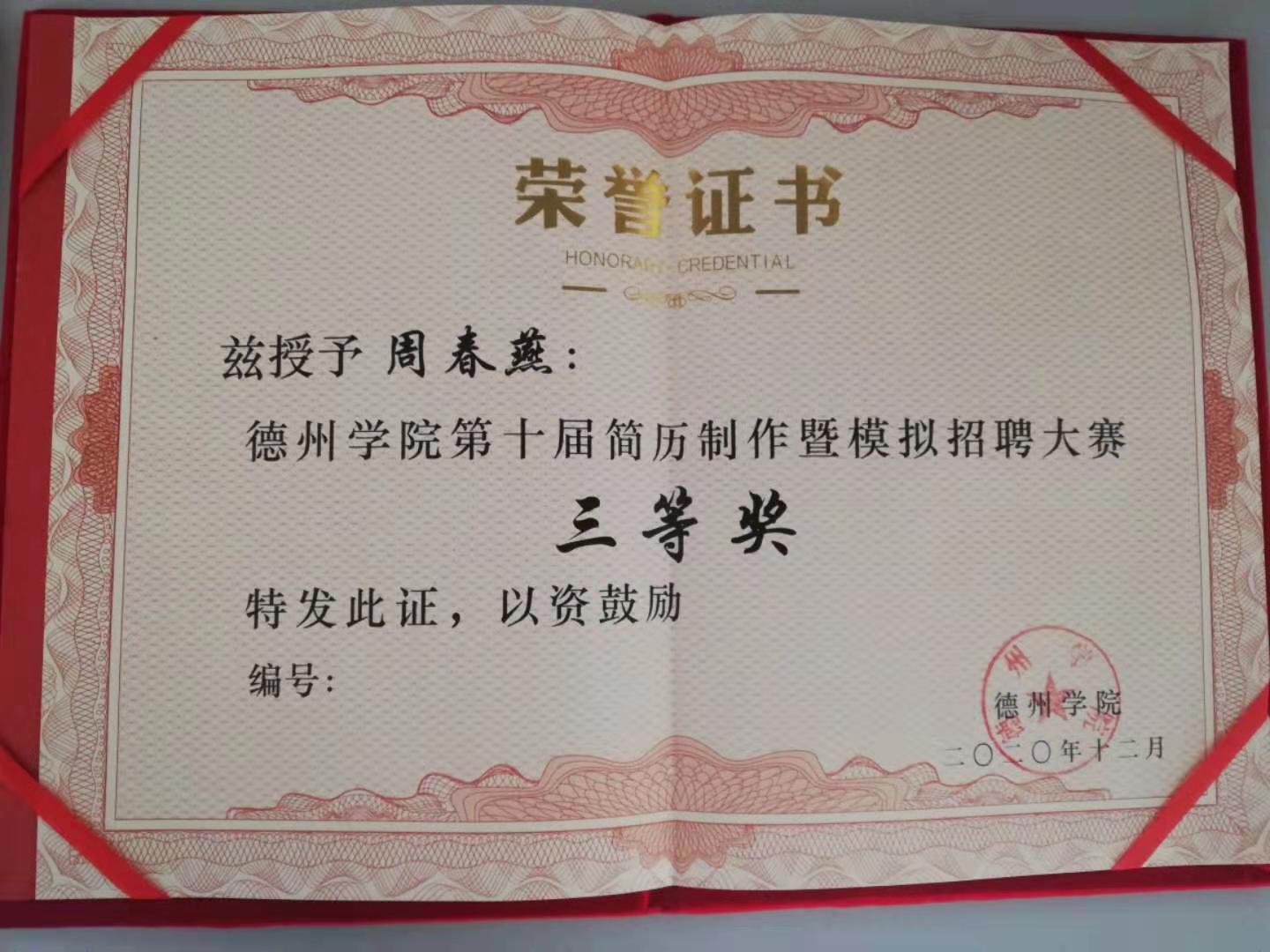 近日,bat365中文官方网站2020年度大学生简历制作及模拟招聘大赛圆满结束,全校15名同学分获一、二、三等奖。bat365官网2018级行政管理专业本科班张静茹、周春燕同学获得大赛三等奖,其中周春燕同学还获得大赛最佳简历制作奖。bat365官网米彦老师荣获优秀指导教师奖。