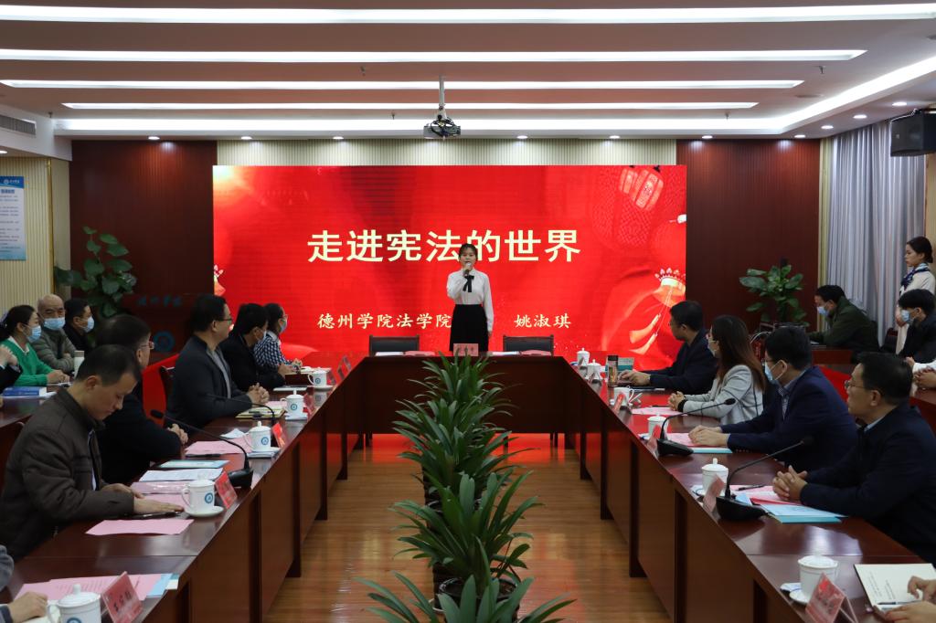 2021年山东省大学生“学宪法 讲宪法”比赛二等奖获奖选手、bat365中文官方网站2020级法学本科班姚淑琪同学现场演讲了她的比赛获奖作品“走进宪法的世界”。