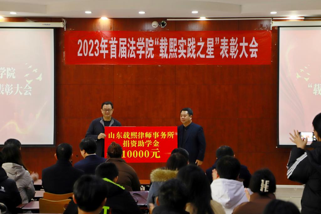 活动中,山东载熙律师事务所向学校捐赠了教育基金,双方领导为在山东省高校“学宪法讲宪法”比赛和山东省高校大学生模拟法庭大赛中取得优异成绩的同学颁发了“载熙实践之星”奖杯。