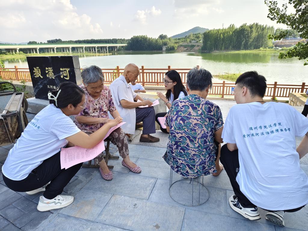 服务团走进古运码头遗址,在运河沿岸,团队成员充分了解了大运河德州段历史航运功能及滋养生息的繁荣景象,并通过发放问卷、宣传材料的方式,促进法律知识从老百姓的‘指尖’走进‘心尖’,努力使尊重法律、保护环境、绿色发展的观念深入人心。