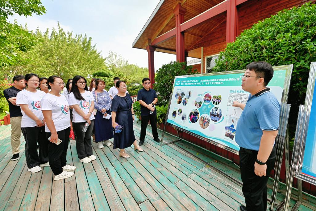 在黄河河畔,服务团成员切身感受黄河生态环境的改善,了解到面对黄河流域生态环境保护的严峻挑战,平阴县积极构建黄河生态廊道,有效防止水土流失,保护黄河沿岸的生态环境。在黄河玫瑰湖国家湿地公园,团队成员在工作人员的带领和讲解下,参观了湿地科普馆,观看了湿地沙盘模型和《湿地的形成与发展》专题纪录片,了解到湿地的保护与开发是黄河生态保护与高质量发展的重要基础,对近年来湿地生物多样性显著提升、生态环境日益改善,展现出的“碧山黄河玉湖,玫瑰丛林湿地,自然田野人家”的景象赞叹不已。