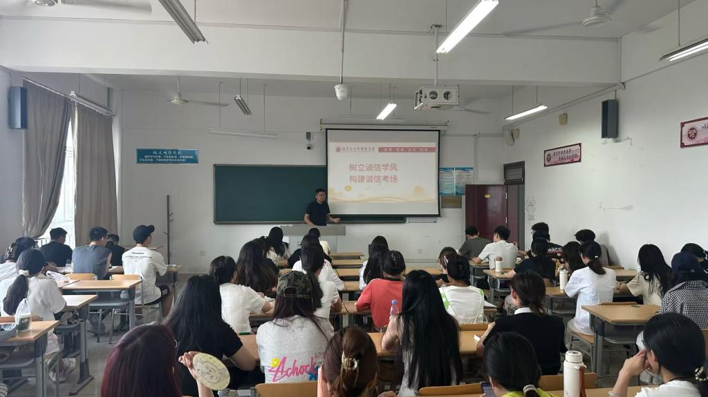 诚信教育先行,筑牢思想根基。学院以主题班会为阵地,组织全体学生深入学习考试纪律,郑重签署《诚信考试承诺书》,让诚信理念入脑入心。教学楼内,“用诚信答考卷,以品德迎人生”签名墙活动吸引众多学子驻足签名,表达践行诚信的决心。同时,教学楼内醒目的宣传板、悬挂的诚信应考横幅,以及通过微信公众号、班级群密集推送的《学生考试违纪、作弊警示清单》,共同织就了立体化宣传网络,让诚信应考氛围无处不在。