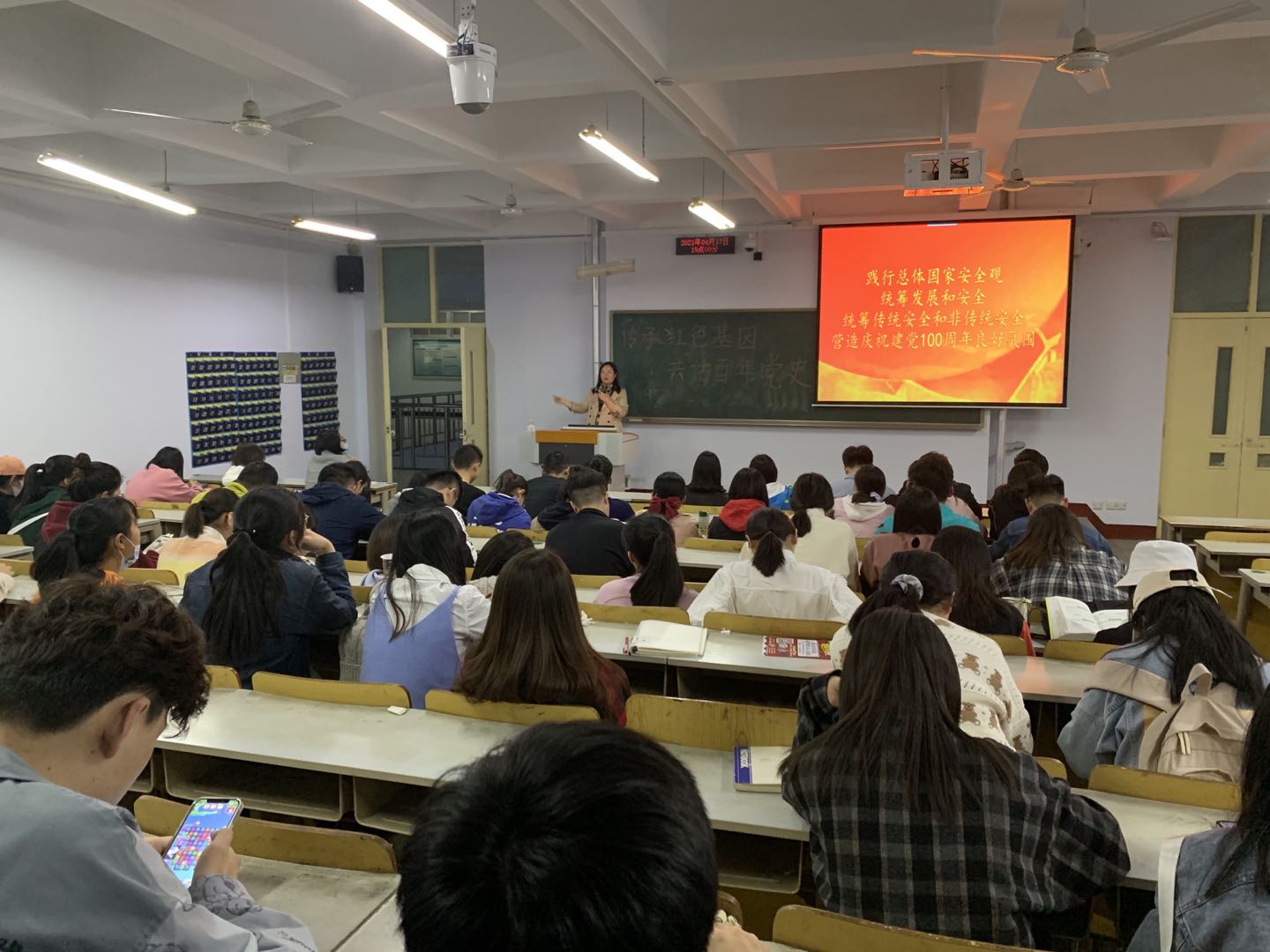 班会伊始,徐世慧老师引领同学们学习《中国共产党简史》五四运动和马克思主义的传播,并集中观看了《党史故事100讲》之“五四运动 唤醒民众”。集中观看党的辉煌成就、光荣传统、革命精神,重温中国共产党传奇的建党历程。此外,徐世慧老师就公寓工作、《bat365中文官方网站学生违纪处分条例(修订)》的指导学习、提高学生网络安全防范意识等方面作出解读。