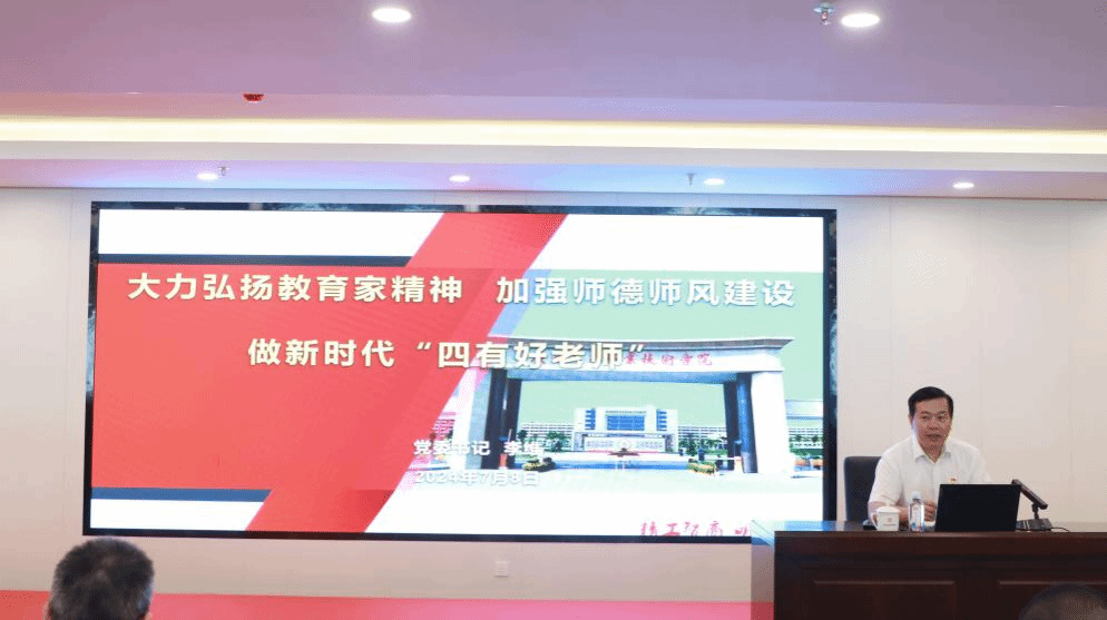 7月8日下午,学校党委书记李维为新进教师开展了《师德师风》专题授课,他从学习习近平总书记关于大力弘扬教育家精神的重要指示、《新时代高校教师职业行为十项准则》解读、寄语广商院青年教师明德修身做新时代“四有好老师”三个方面为学员们进行讲述。他表示,教师之本,在于师德。对于立教之本、兴教之源的教师来说,重德、有德、守德自然更是重中之重。师德师风严不严、正不正,直接关乎下一代的健康茁壮成长,也关涉我国教育事业的高质量发展和良好社会风气的生长培育。他强调,青年教师要从明德修身、好学不倦、勤勉实干、严格自律四个方面努力做新时代“四有好老师”。此次《师德师风》专题授课进一步激发了青年教师坚守初心使命、扛起教育担当,将学习成果转化为实际行动,以饱满的热情和昂扬的斗志全力以赴投入到学校高质量发展各项工作任务中,为学校的发展注入新的活力和动力。