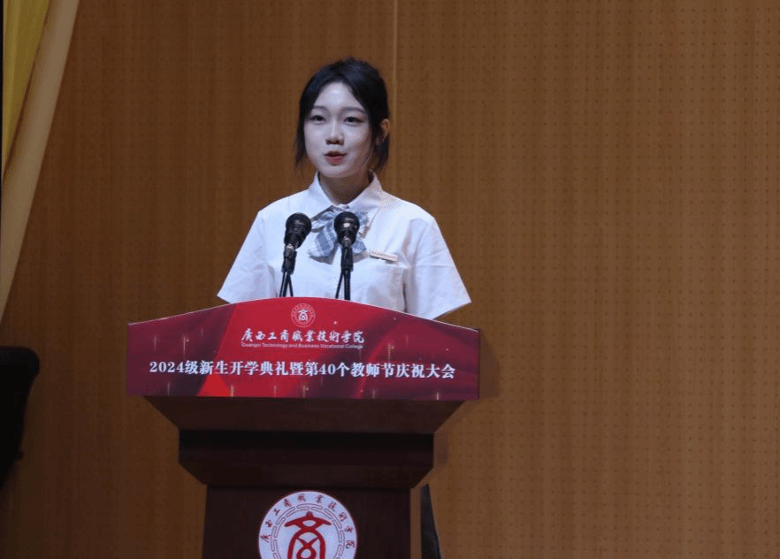 优秀在校生代表李宇琦分享了在大学学习生活的感悟,鼓励新同学要积极融入集体生活、做好学业规划、勇于尝试、敢于挑战,让青春之花在广商院绽放,创造出自己的精彩人生。