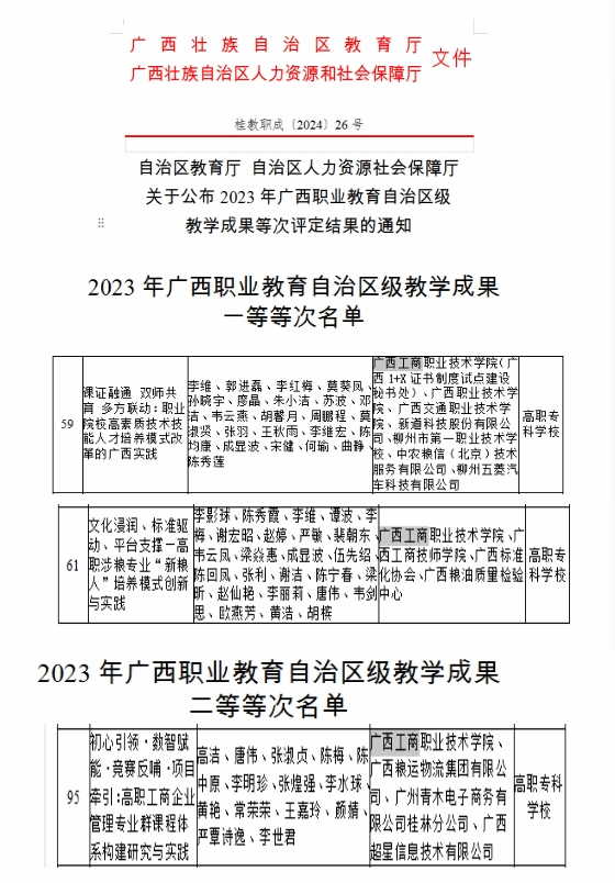 李维教授主持的《课证融通 双师共育 多方联动:职业院校高素质技术技能人才培养模式改革的广西实践》和李影球教授主持的《文化浸润、标准驱动、平台支撑—高职涉粮专业“新粮人”培养模式创新与实践》均获得一等等次,高洁教授主持的《初心引领·数智赋能竞赛反哺·项目牵引:高职工商企业管理专业群课程体系构建研究与实践》获得自治区二等等次。