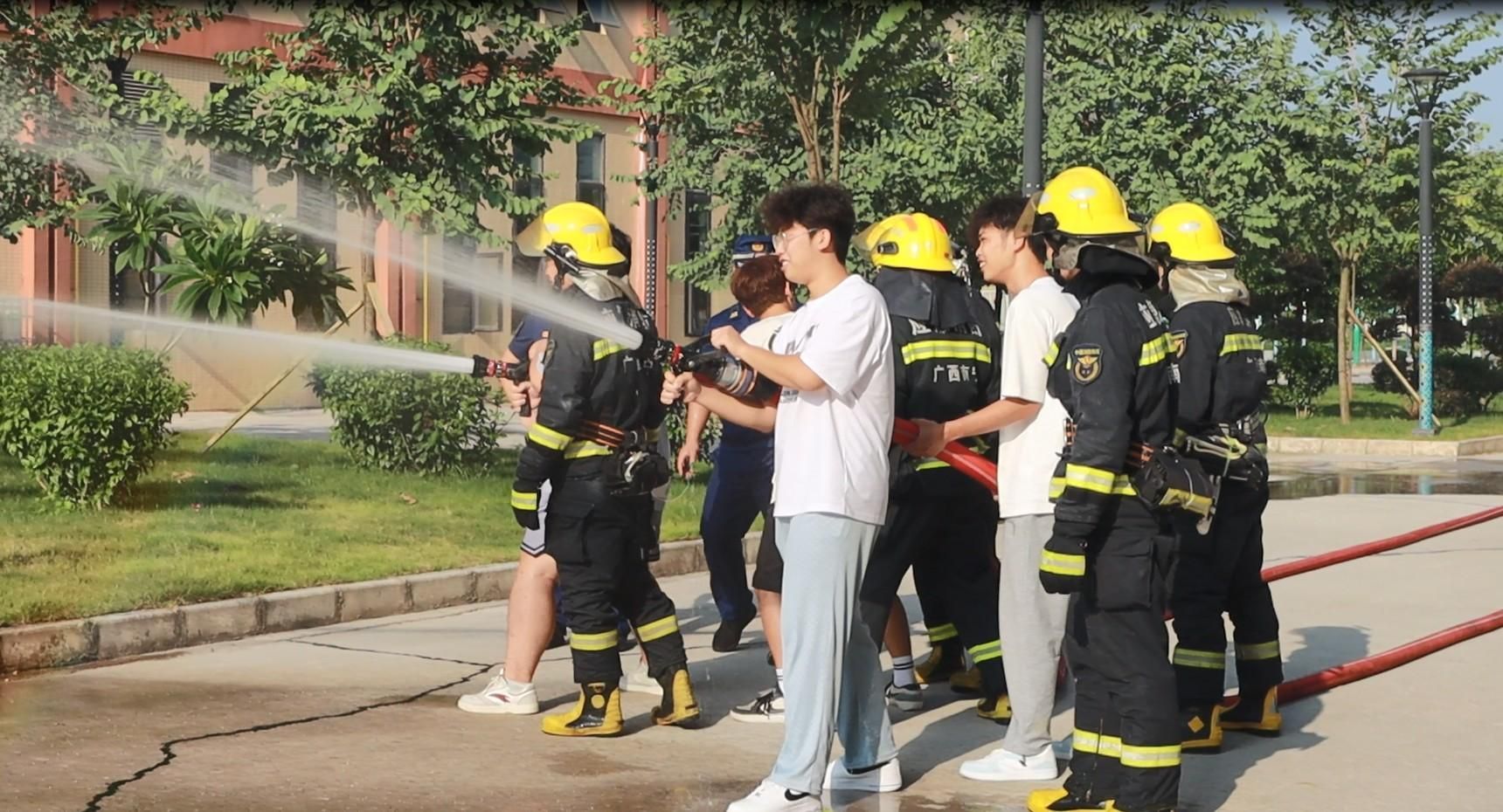 讲座结束后还开展了消防实战演练活动,消防队员为新生们介绍了灭火器的分类和使用方法,指导灭火器实际操作,并演示了高压水枪灭火的操作。
