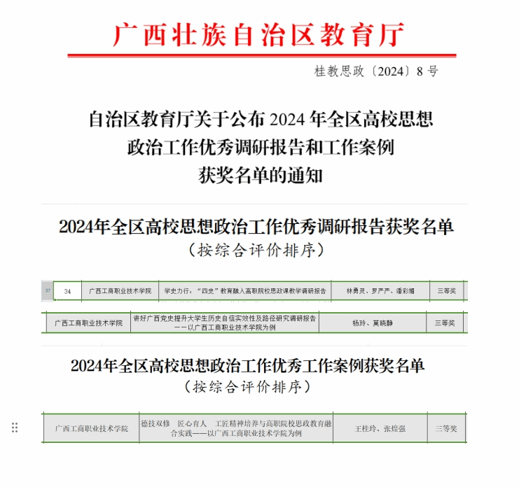 林勇灵、罗严严、潘彩媚的《学史力行:“四史”教育融入高职院校思政课教学调研报告》和杨玲、莫晓静的《讲好广西党史提升大学生历史自信实效性及路径研究调研报告——以pp电子官方网站为例》荣获2024年全区高校思想政治工作优秀调研报告三等奖。王桂玲、张煌强的《德技双修 匠心育人 工匠精神培养与高职院校思政教育融合实践——以pp电子官方网站为例》荣获2024年全区高校思想政治工作优秀工作案例三等奖。