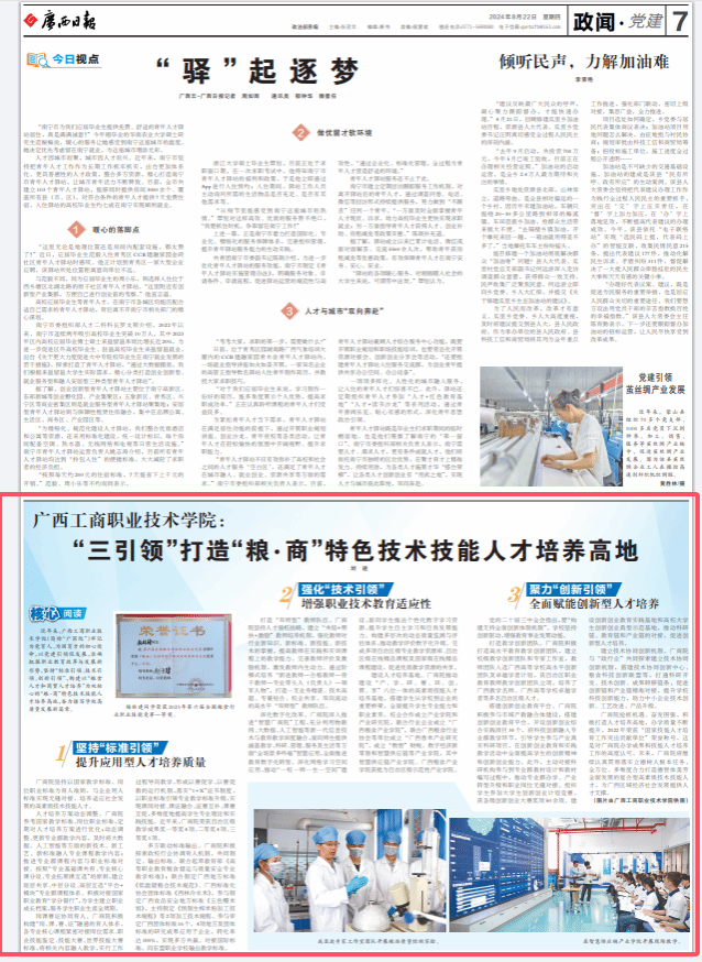 2024年8月22日出版的《广西日报》刊发学校校长刘进署名文章《pp电子官方网站: “三引领”打造“粮·商” 特色技术技能人才培养高地》,全文如下。