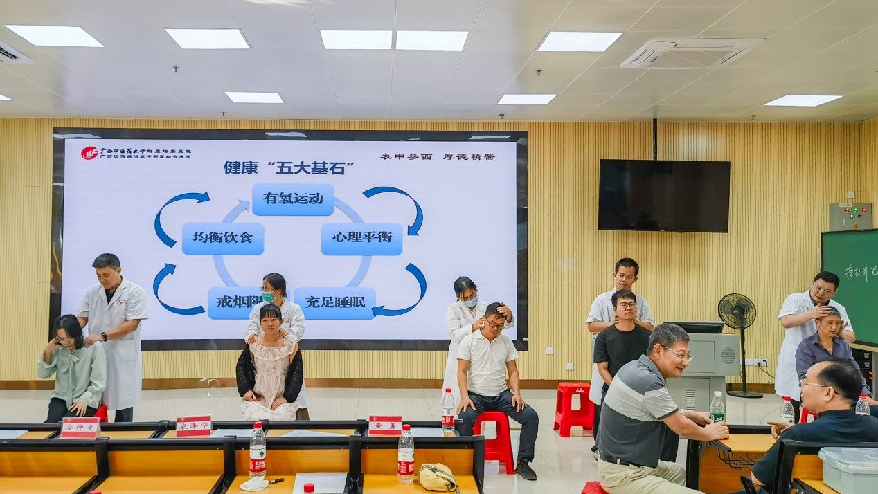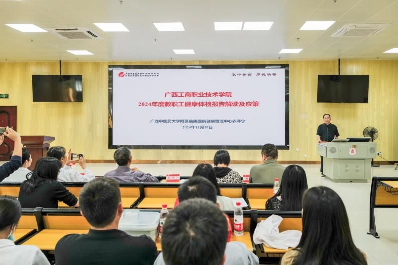 活动首先由广西中医药大学附属瑞康医院农泽宁主任医师结合2024年体检结果作健康讲座,针对体检排名前十项的异常结果进行了分析,对这些疾病产生的原因、症状、危害及预防措施进行了详细的讲解,并对教职工们出现的亚健康问题给出合理化的指导建议。