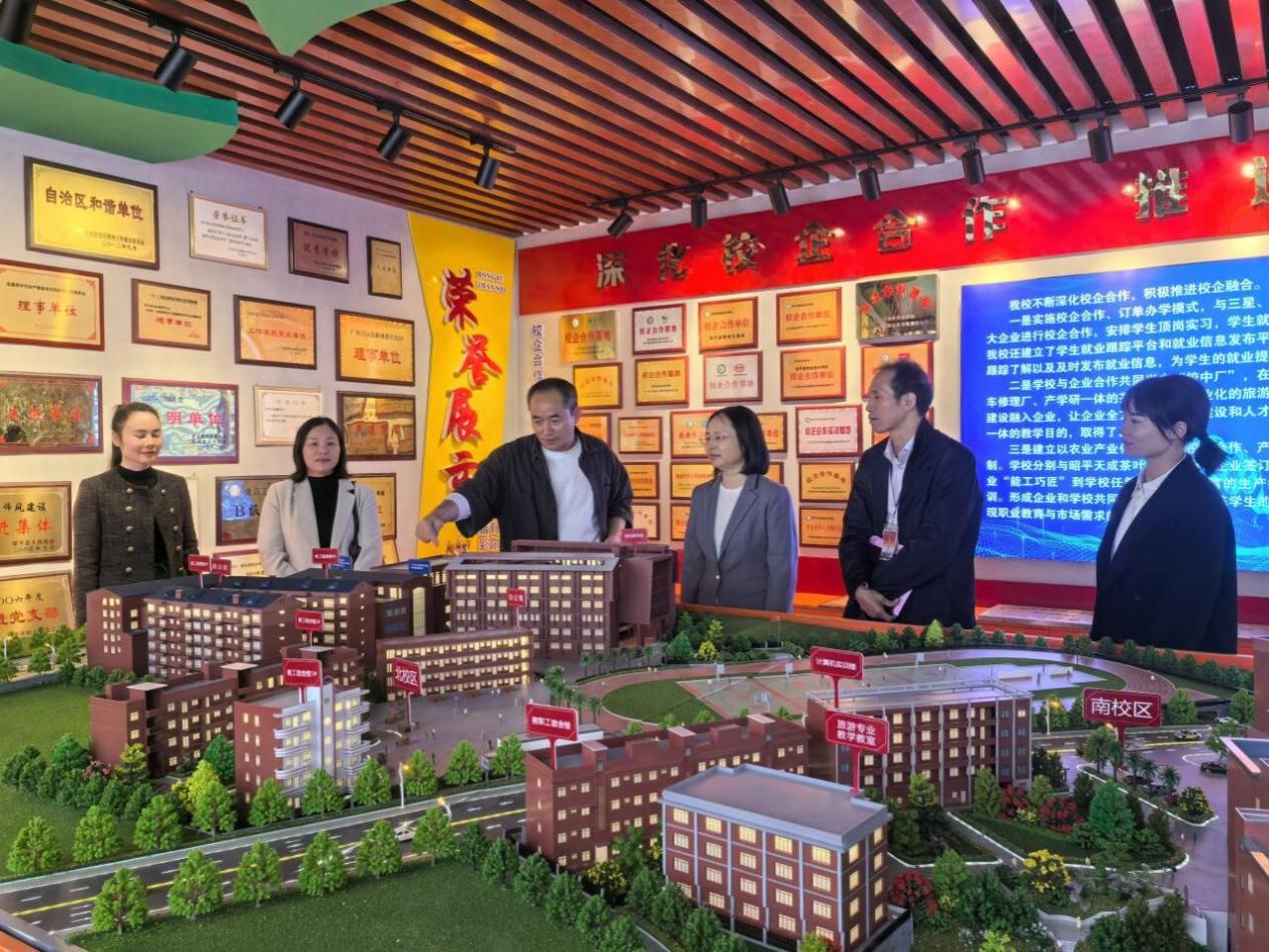 座谈会后,韦云凤一行参观了昭平县职业技术学校的图书阅览室、校史荣誉室、茶文化展厅和校企合作双主体办学产业化实训基地等,进一步了解该校的发展规划、办学条件和校企合作成果。