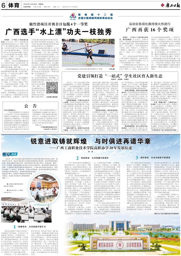 2024年11月28日出版的《广西日报》刊发学校党委书记李维署名文章《锐意进取铸就辉煌 与时俱进再谱华章 ——pp电子官方网站高职办学20年发展综述》,全文如下。