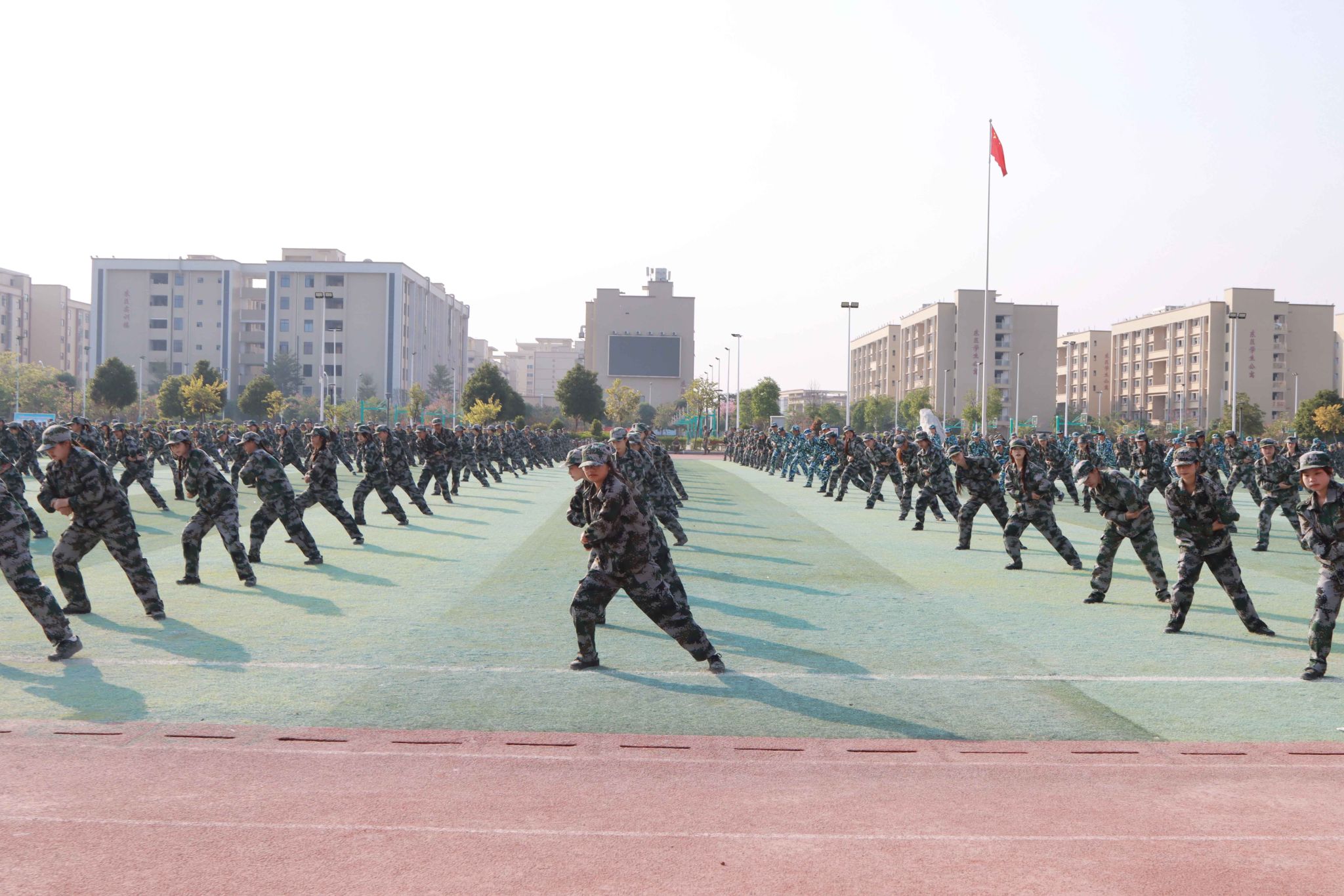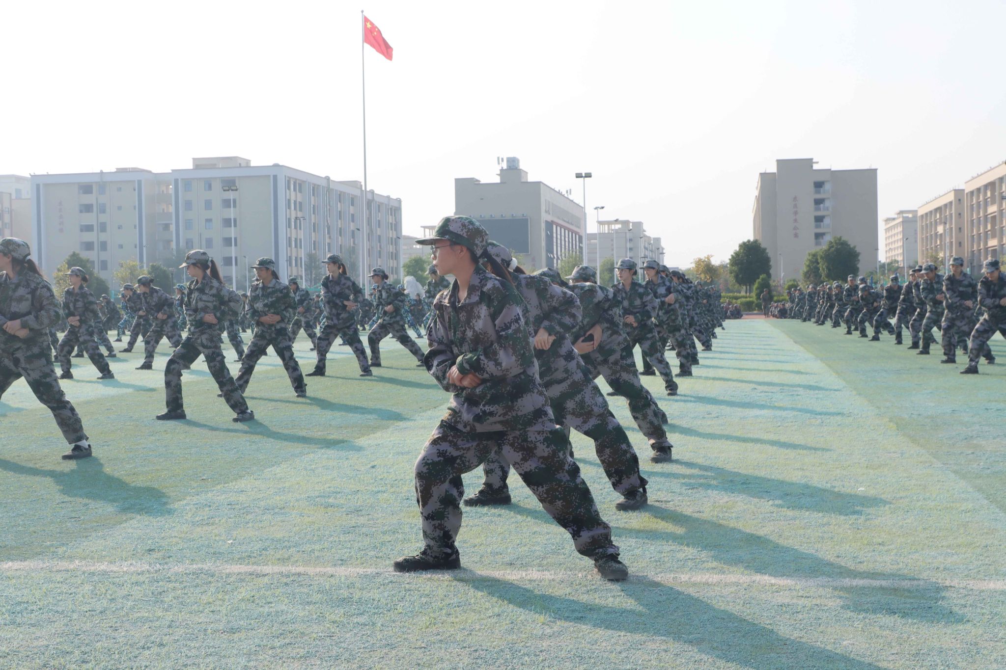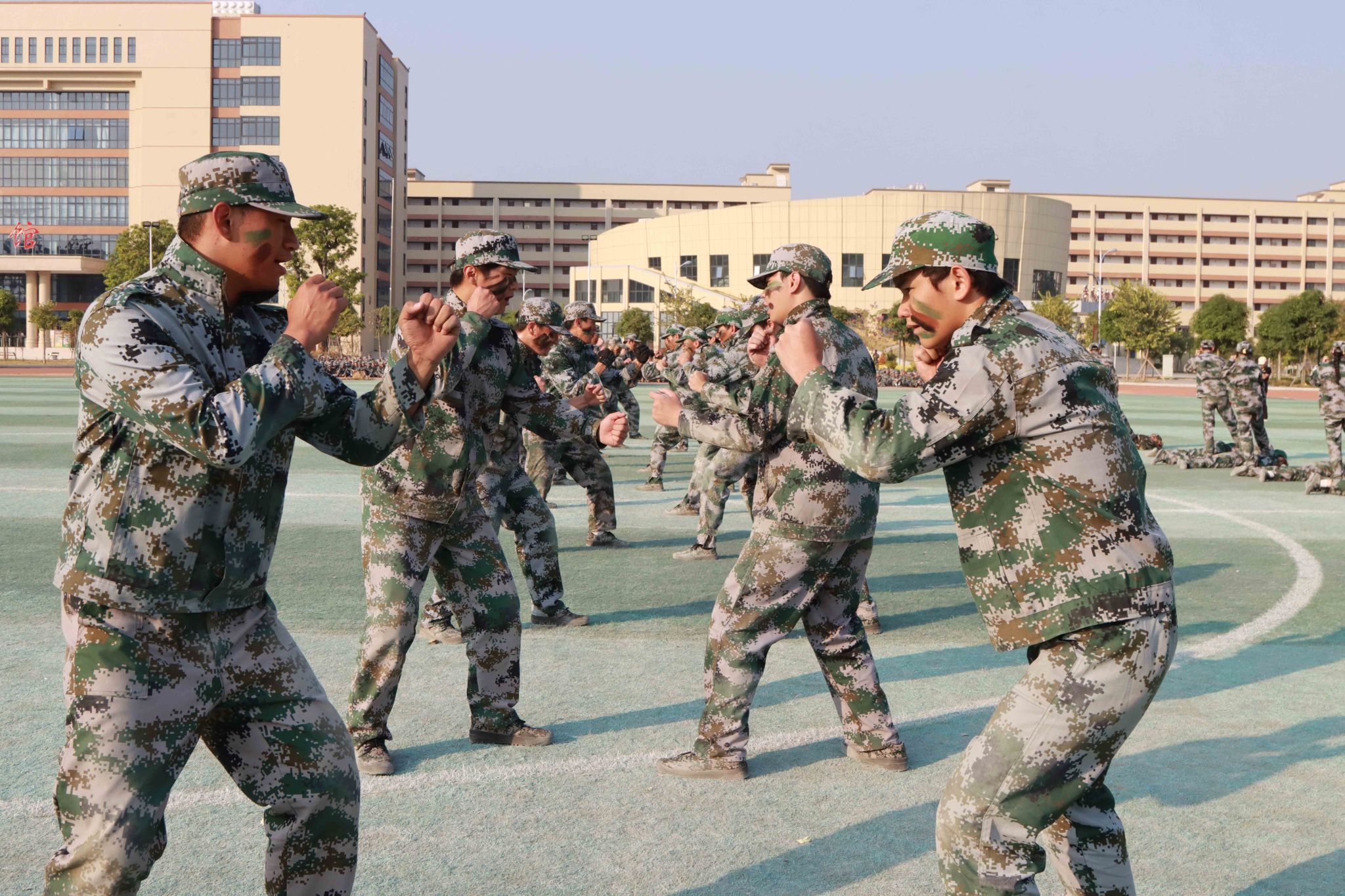总结表彰大会在激昂的国歌声中拉开了帷幕。在分列式汇报展示中,2024级同学们以整齐划一的队列、昂首挺胸的姿态,步伐坚定地走向主席台,干脆利落,动作规范,充分展现了军训期间的刻苦训练成果。汇报表演中,各方队进行匕首操、擒敌拳、刺杀术、匍匐前进等战术表演,坚定的眼神、矫健的身姿、凌厉的拳风,展现出广商院学子不畏艰难、勇于挑战的精神面貌。