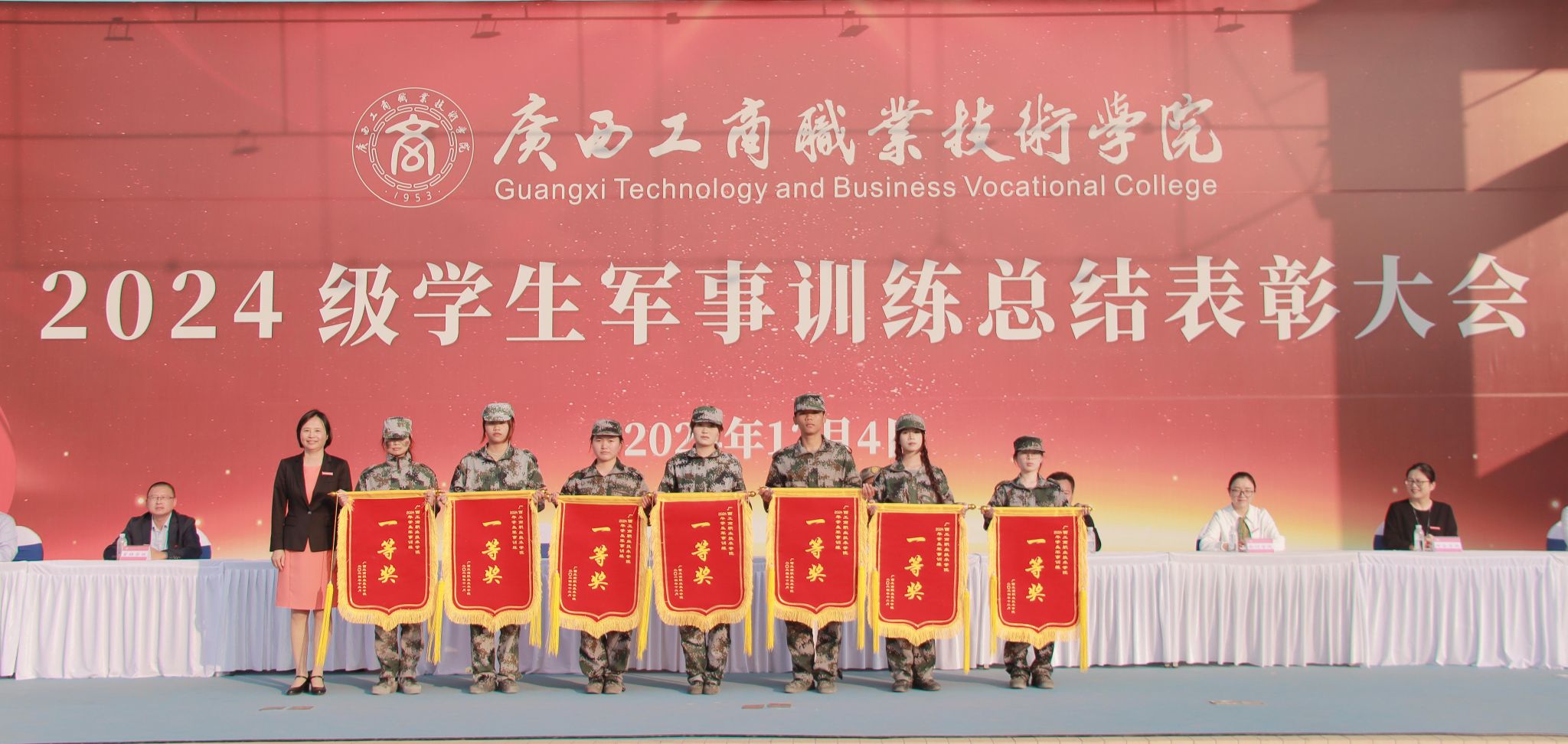 迷彩戎装,英姿飒爽。12月4日,学校在武鸣校区召开2024级新生军事训练总结表彰大会。学校党委副书记、纪委书记韦云凤,良庆区人民武装部军事科科长郑先国同志,教务处、党委学生工作部、后勤管理处、会计学院、管理学院、财金学院、经贸学院、粮油康旅学院相关领导,武鸣校区2024级全体参训学生及辅导员、军训教官以及党委学生工作部相关人员参加大会。