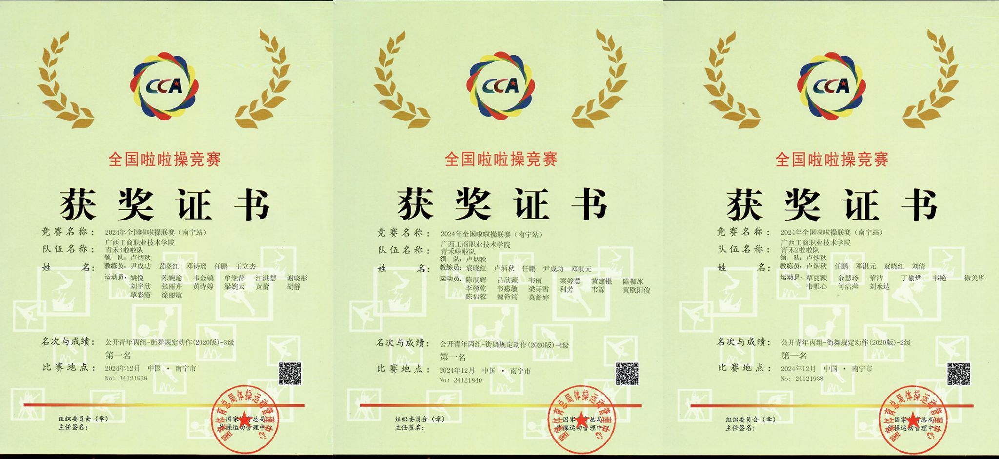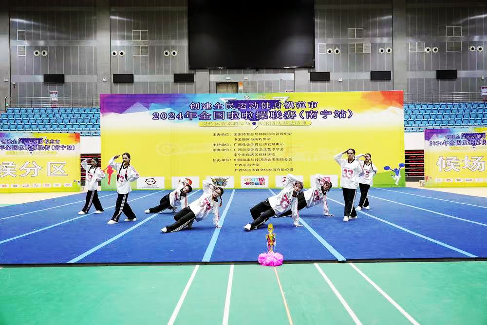 2024年12月6日-8日,由国家体育总局体操管理中心、中国蹦床与技巧协会主办,广西社会体育运动中心、广西学校体育卫生艺术学会承办的2024年全国啦啦操联赛(南宁站)在广西建设职业技术学院举行,来自广西区内外386支参赛队同台竞技。pp电子卢炳秋、尹成功、袁晓红、刘倩、任鹏、邓淇元等6位教师指导的三支参赛队伍获得公开青年丁组集体街舞规定动作2级、3级、4级三个赛项第一名的优异成绩。