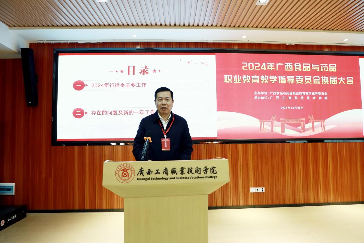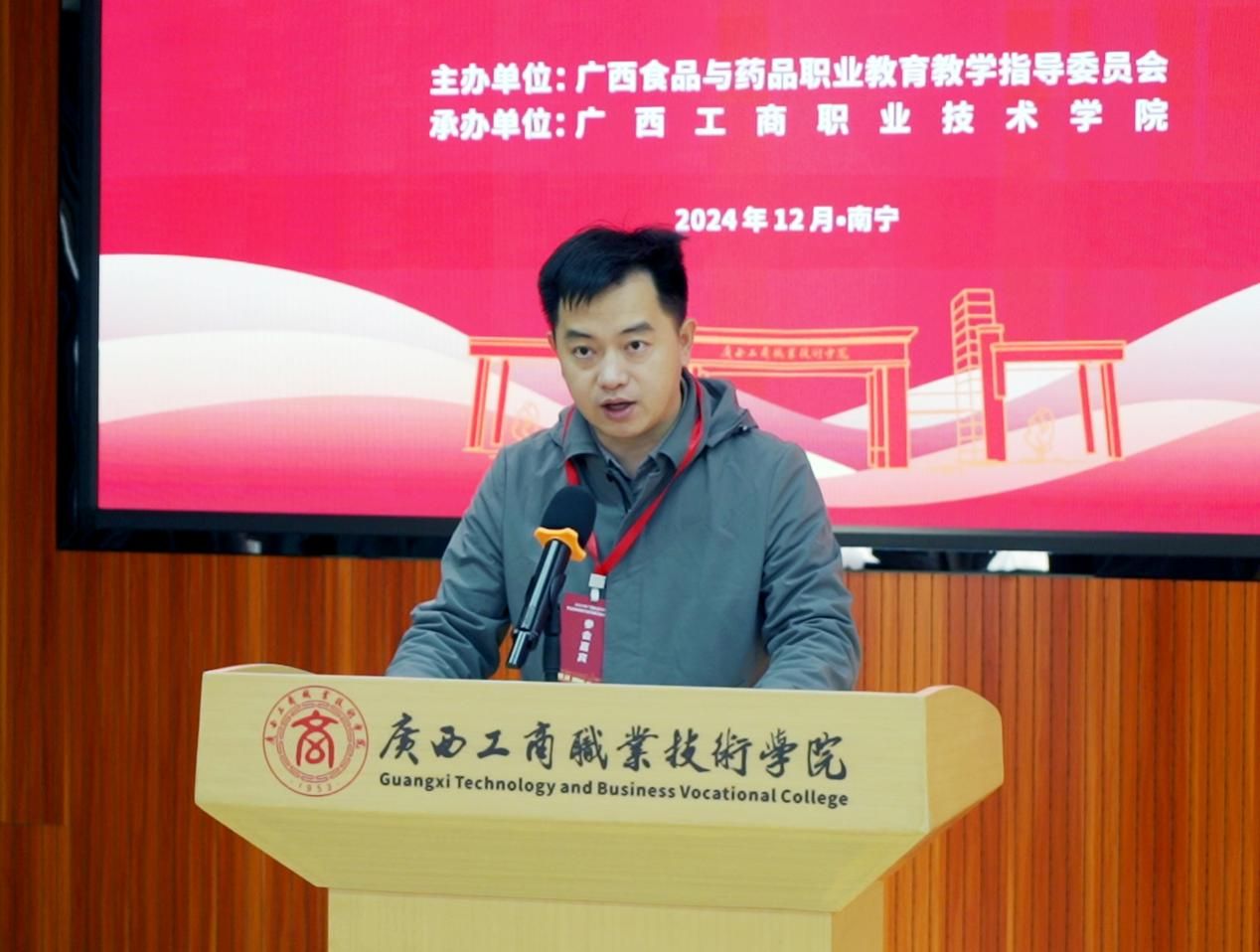 学校党委书记、广西食品与药品行指委副主任委员李维作广西食品药品专业教育教学指导委员会2024年工作总结及2025年工作计划。他表示,在自治区教育厅、自治区工信厅的领导下,广西食品与药品行指委统筹各成员单位积极配合,今年圆满完成了行指委工作计划和行动计划提出的阶段性任务,教育教学质量显著提升。李维指出,新一届行指委将紧紧围绕国家深化教育教学改革决策部署,切实推动食品药品职业教育取得新成效。一是进一步加强工作信息报告机制,完善行指委委员的工作职责,促进各单位建设经验交流。二是要做好顶层设计,打造高水平专业群;加强校企合作,建设一流核心课程;完善管理机制,校企双元开发新形态教材;进培养结合,建设高水平双师队伍;深化产教融合,打造行业产教融合共同体;推动职教出海,为“一带一路”建设献“粮”策。