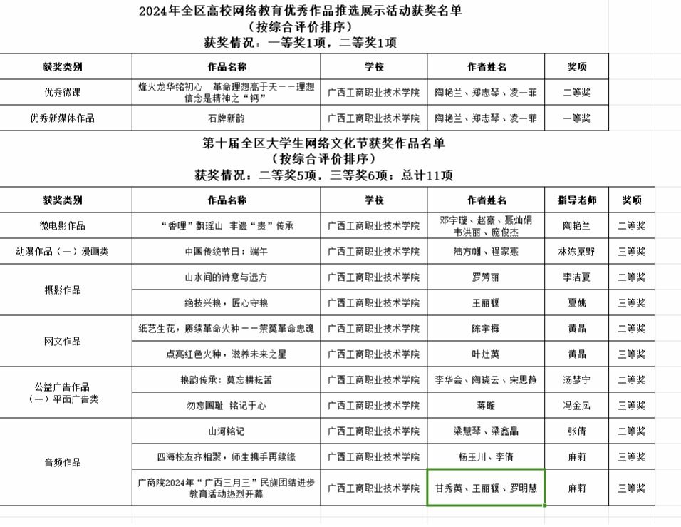 近日,自治区教育厅和自治区党委网信办公布第十届全区大学生网络文化节和2024年全区高校网络教育优秀作品推选展示活动获奖名单,pp电子在优秀微课、优秀新媒体作品、微电影、漫画、摄影、网文、公益广告、音频等8类作品的征集中荣获13个奖项,其中一等奖1个、二等奖6个、三等奖6个。