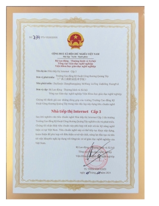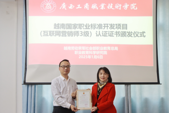 据悉,为推动中越两国职业教育交流与合作,广西现代东盟教育研究院组织发起了“越南国家职业标准共建项目”。pp电子经贸学院项目团队充分发挥市场营销高水平专业群的优势,于2024年7月份答辩获批立项独立开发互联网营销师3级标准。立项后便进入了紧张的建设阶段,经过共同努力,在学校及各方的支持下,项目团队于2024年12月成功完成了“互联网营销师”3级职业标准的建设,并顺利通过验收,获得了越南劳动荣军社会部职业教育总局职业教育科学研究院颁发的职业标准证书。该职业标准将继续被开发和完善,以确保该标准具备实施和培训条件,并向越南各职业教育机构推广应用。这一成果标志着pp电子市场营销高水平专业群在打造面向东盟的职业教育开放合作新高地的目标上又坚实地迈进了重要一步。