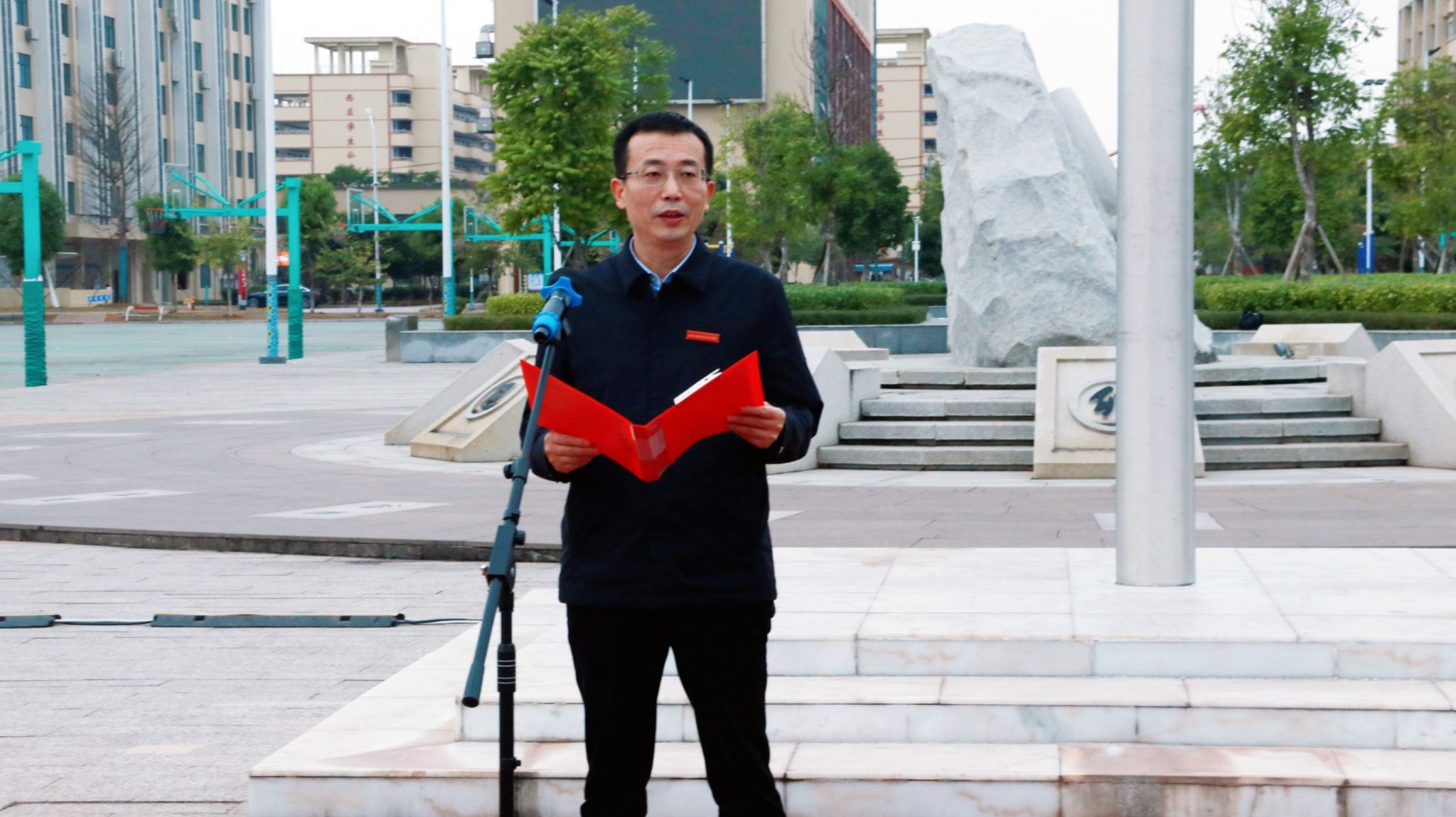 在雄壮的国歌声中,五星红旗冉冉升起,全体师生肃立注目,表达对祖国的崇高敬意。