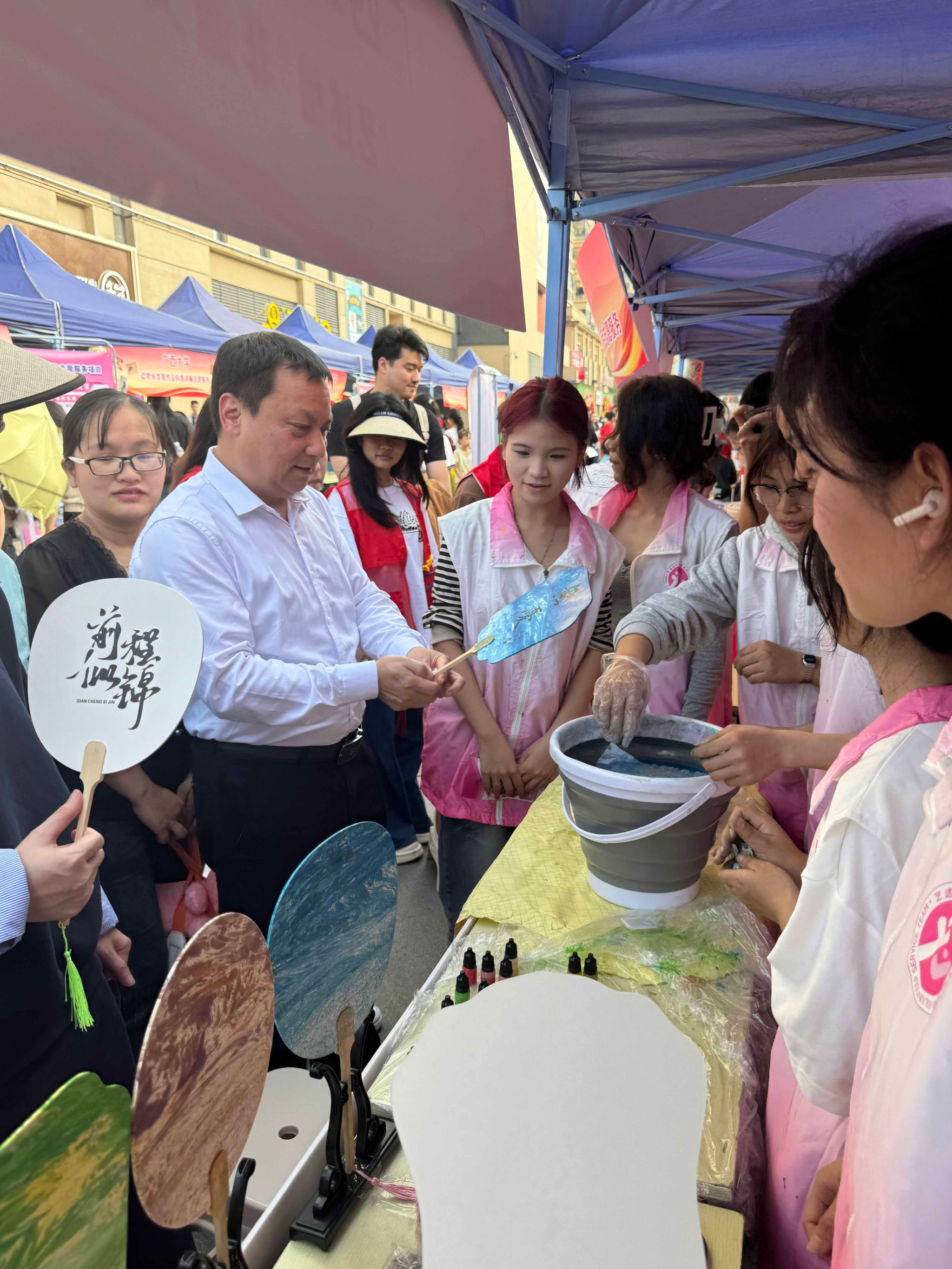 南宁市社会工作部副部长陈仕成来到学校“艺述绘”青年志愿服务队的摊位进行活动体验。他对pp电子志愿者的热情服务和创新精神给予了高度评价,并表示这样的活动不仅有助于传承和弘扬传统文化,还能够增强市民的志愿服务意识,推动社会文明进步。