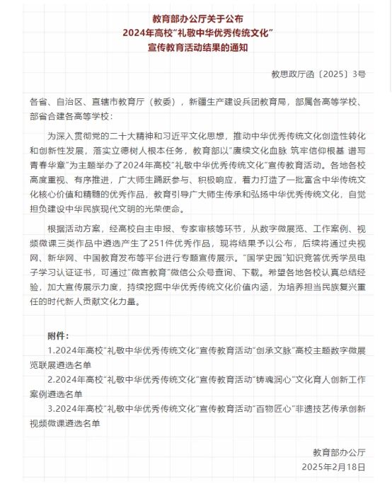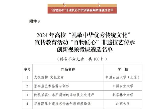 近年来,学校高度重视中华优秀传统文化教育和传承工作,将其作为落实立德树人根本任务、培育和践行社会主义核心价值观的重要抓手。学校开设中华优秀传统文化相关课程、举办传统文化讲座和活动、支持学生社团开展传统文化活动等,积极营造浓厚的校园文化氛围,引导广大师生坚定文化自信,传承和弘扬中华优秀传统文化。学校将以此次入选教育部优秀作品为契机,持续挖掘中华优秀传统文化价值内涵,结合时代要求继承创新,为培养担当民族复兴大任的时代新人贡献文化力量。