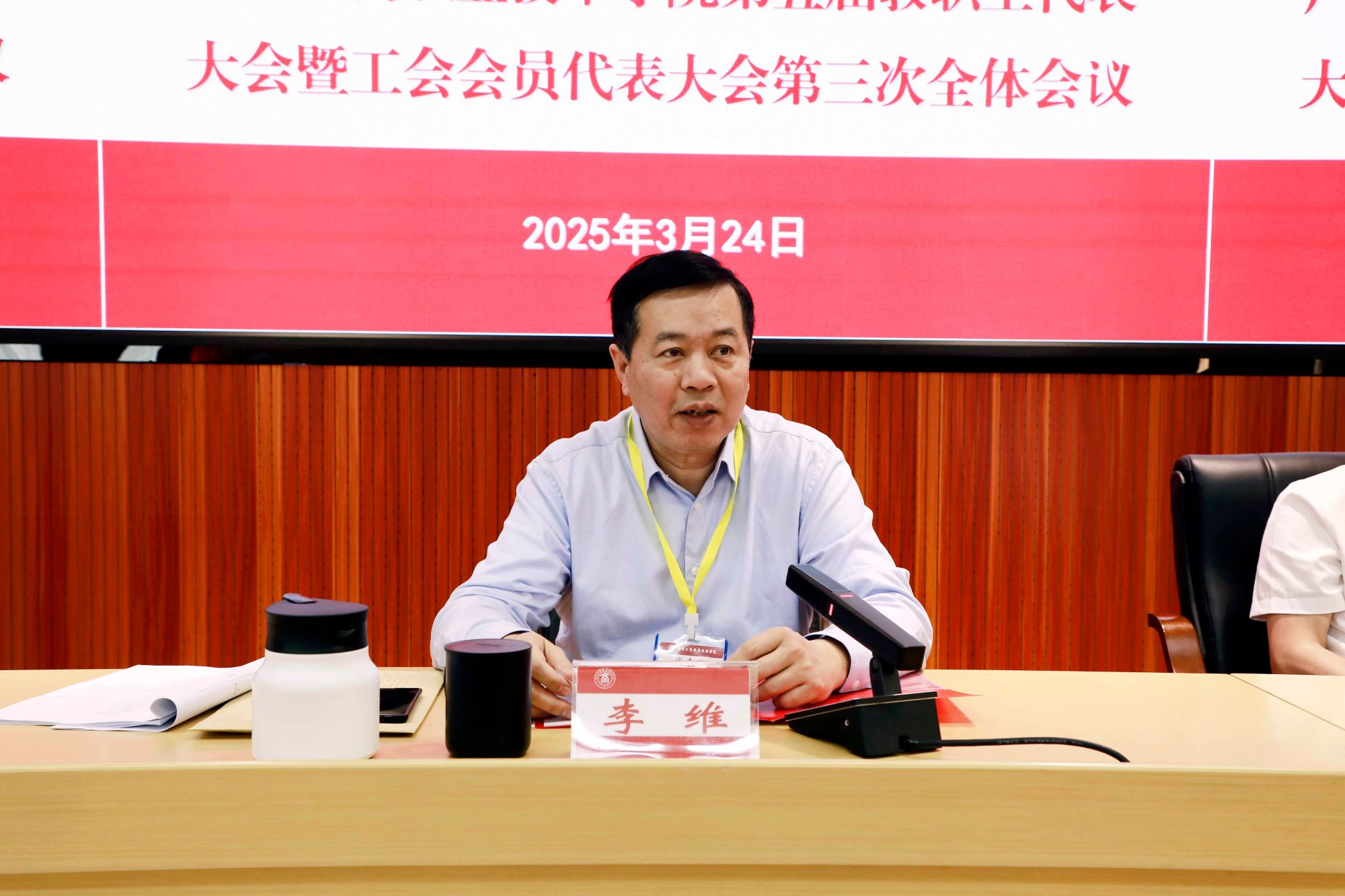 党委书记李维在闭幕会上作讲话。他指出,本次大会期间各代表提出了宝贵的意见和建议,体现了全体教职工对共同发展学校各项事业的主人翁精神,也充分反映了各位代表依法参政议政、积极参与学校民主管理意识的增强和水平的提升。各位代表所提的意见和建议,为领导班子的科学决策和学校今后更高质量的创新发展提供了重要的启示和参考。