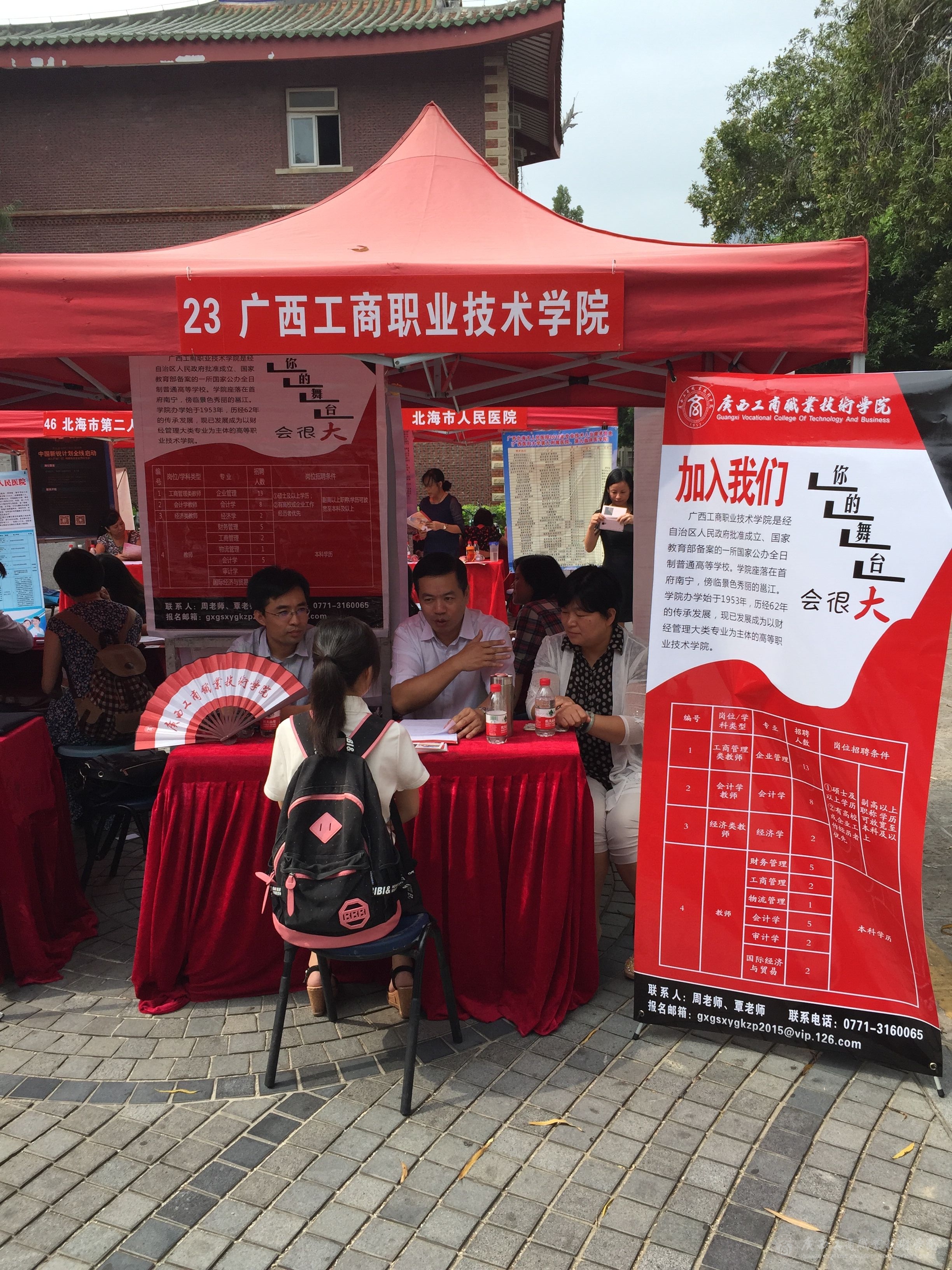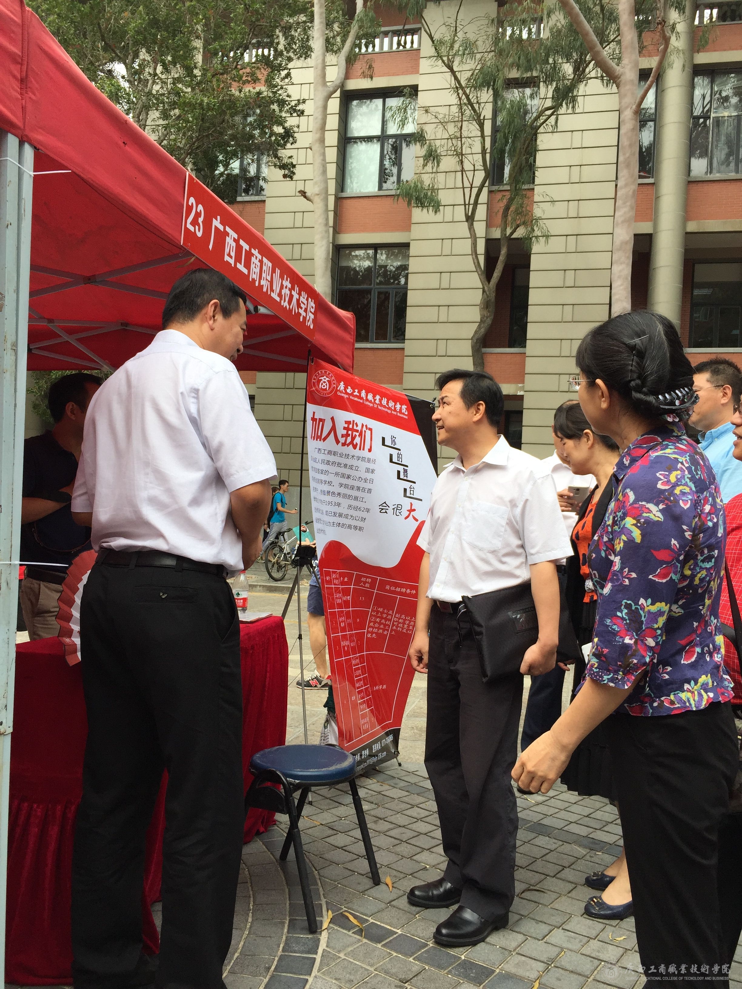 招聘会期间,自治区党委组织部部务委员、副巡视员曾凯同志到pp电子展位指导工作,向李维副院长了解了招聘情况,称赞我院的展架设计和文化扇富有工商特色。