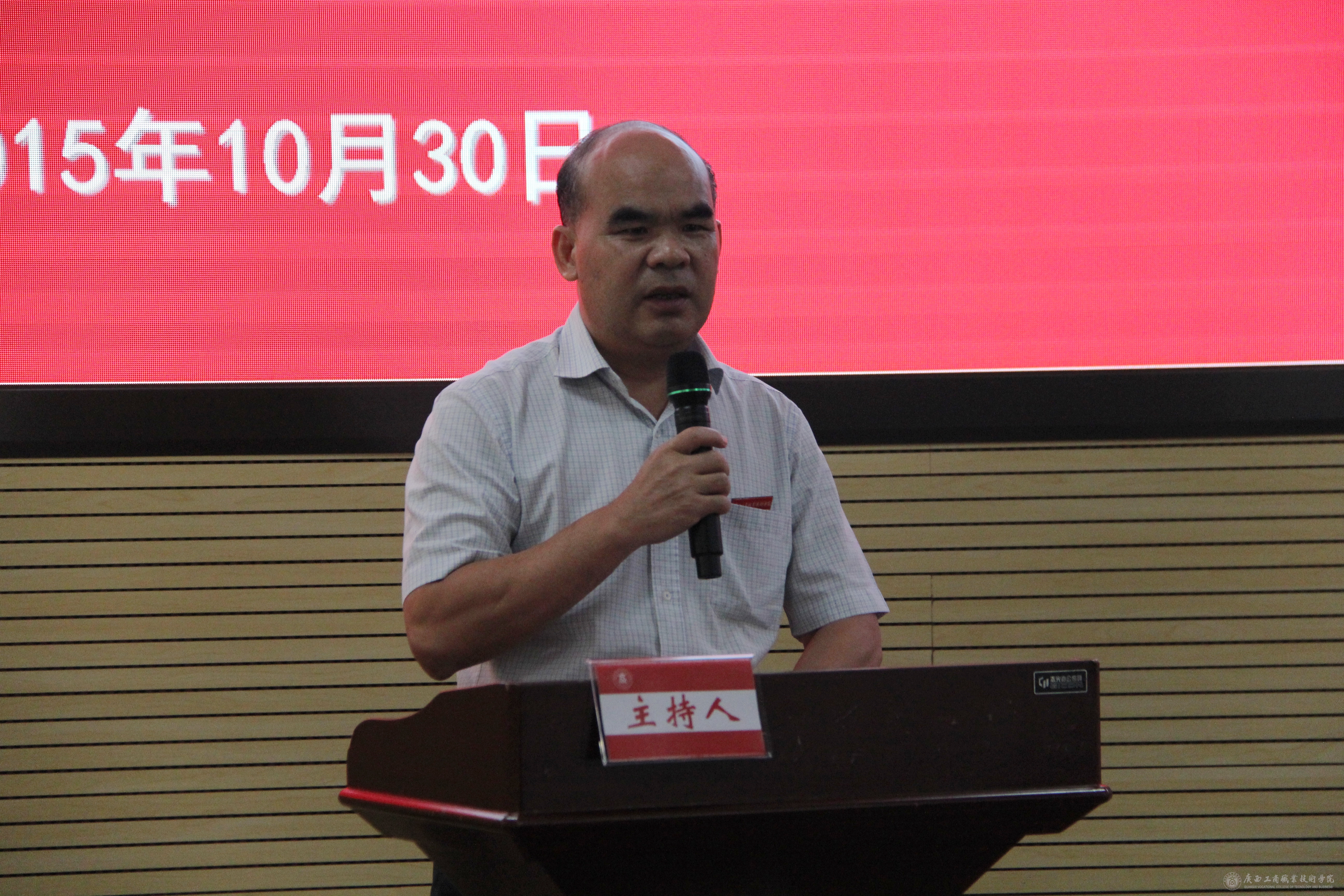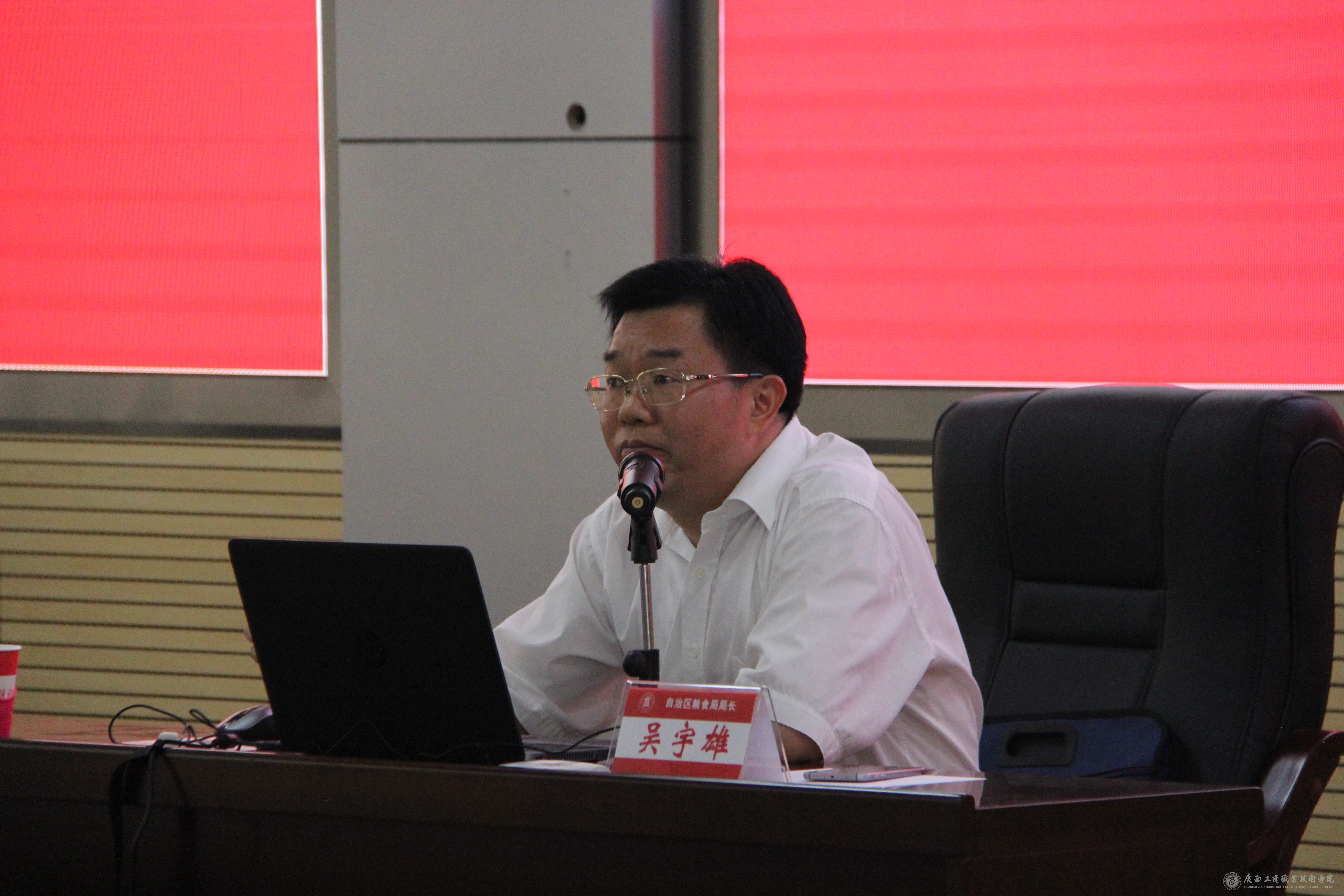 2015年10月30日下午,我院邀请自治区粮食局吴宇雄局长作“三严三实”专题报告。报告会在我院校本部2119 会议室举行。学院党委书记覃武云、党委副书记蒙启成、副院长李仕钦、副厅级调研员黄永蓬、自治区粮食局办公室副主任朱其俊,以及我院副科级以上干部、社科部全体教职工和学生干部代表参加了报告会,报告会由覃武云书记主持。