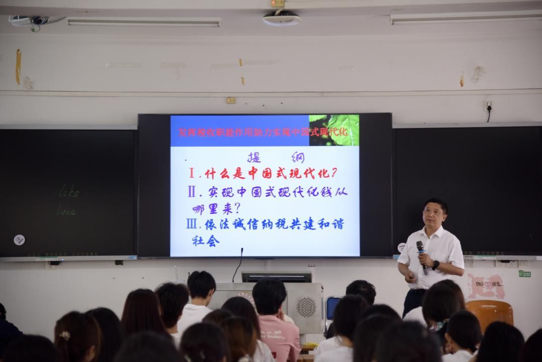学校党委副书记安仲文以《发挥税收职能作用助力实现中国式现代化》为题,为室内2407班、室内2408班的同学讲授思政课。他结合党的二十届三中全会精神讲述中国式现代化及其本质特征,通过梳理税收的起源与发展、我国税种类型等揭示我国实现中国式现代化的资金来源,结合税收的作用、丰富的税收数据,深入浅出地讲解税收在助力中国式现代化建设中发挥的作用,帮助同学们直观地了解国家税收的重要意义。