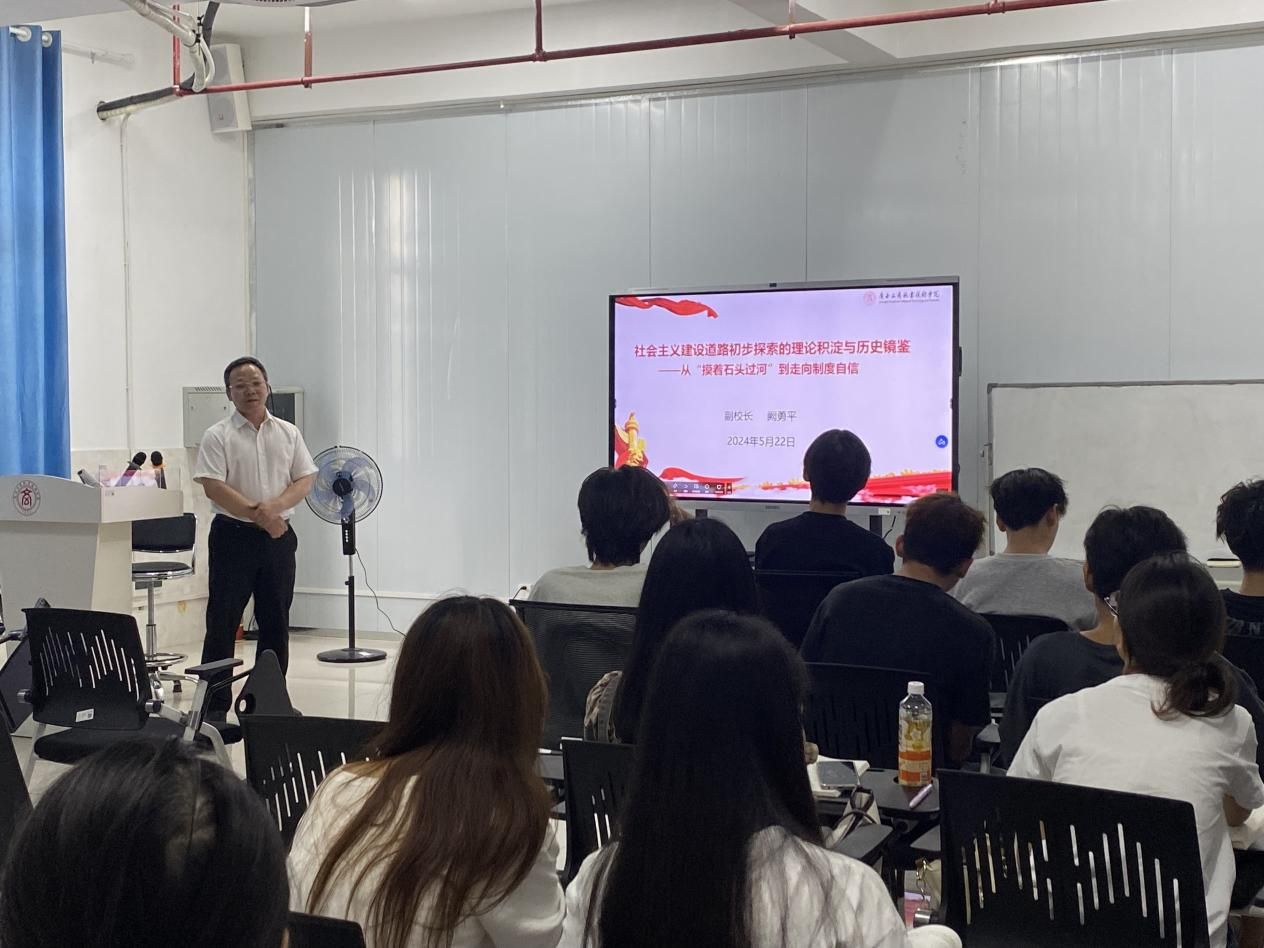 学校副校长阙勇平以《社会主义建设道路初步探索的理论积淀与历史镜鉴——从“摸着石头过河”到走向制度自信》为题,给会信2402班的同学们带来了一堂精彩绝伦的思政课。他运用相关事例进行讲解,丰富了同学们对社会主义发展阶段、“四个现代化”战略目标,以及科学教育文化工作、国防建设、祖国统一和外交工作等思想理论成果的认识,帮助同学们增强我国社会主义制度的自信心。