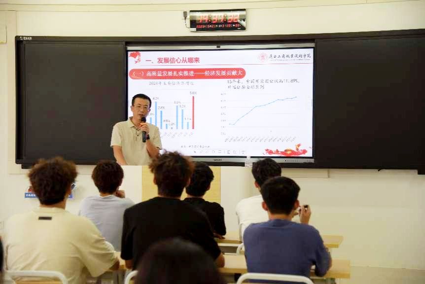 学校校长刘进为营销2305班学生讲授《中国经济行稳致远》主题思政课。他广泛分析国内外、区内外时政热点,从“发展信心从哪来、迎难而上靠什么和奋发有为怎么干”三个维度,层层递进,深入阐述中国经济行稳致远的内在逻辑和有效举措。授课过程中,刘校长通过详实的数据、生动的案例,让同学们深刻认识到中国经济在复杂多变的全球形势下所展现出的强大韧性和潜力,极大地增强了同学们对国家发展的信心与责任感。刘进校长还鼓励同学们关注时代发展,提升自身能力,积极投身到国家经济建设之中。