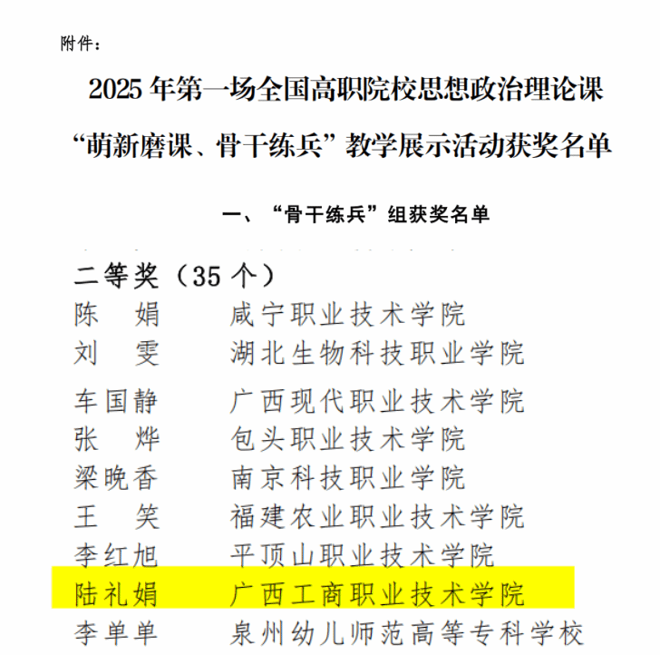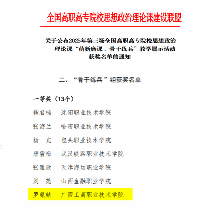 近日,2025年全国高职院校思想政治理论课“萌新磨课、骨干练兵”教学展示活动评选结果公布。本次活动按照不同课程分为三场,包含萌新磨课”和“骨干练兵”两大组别,“省内初选、线上复选、现场展示”等三个环节。pp电子马克思主义学院教师罗氰献荣获第三场“骨干练兵”组一等奖,陆礼娟荣获第一场“骨干练兵”组二等奖。