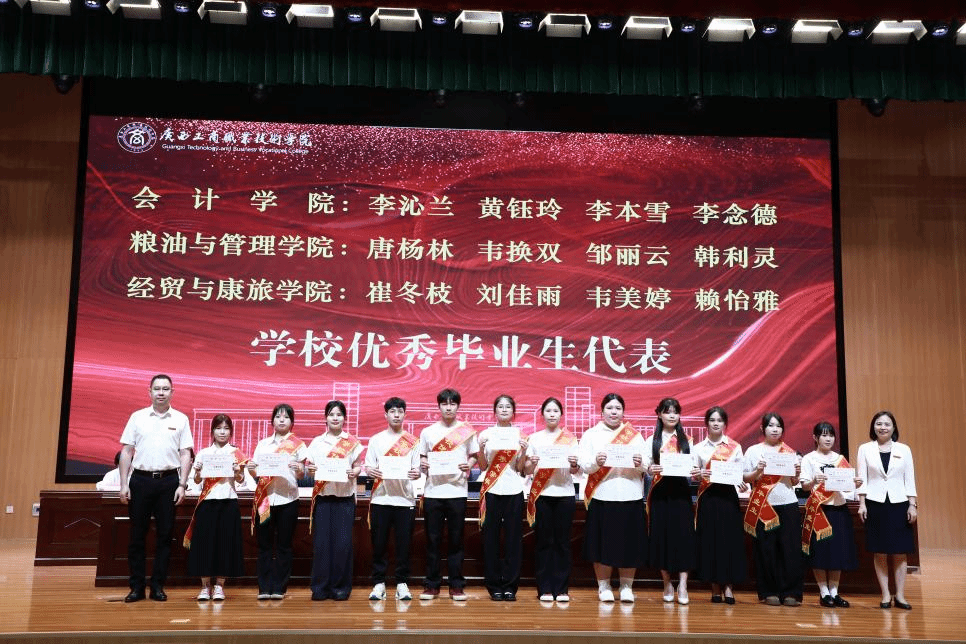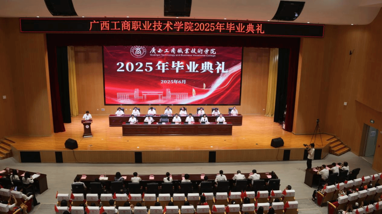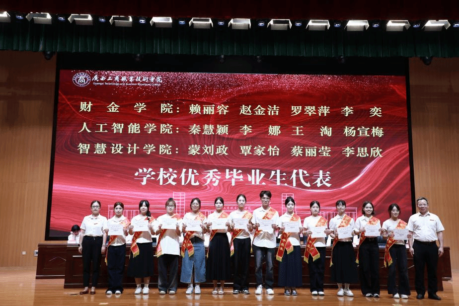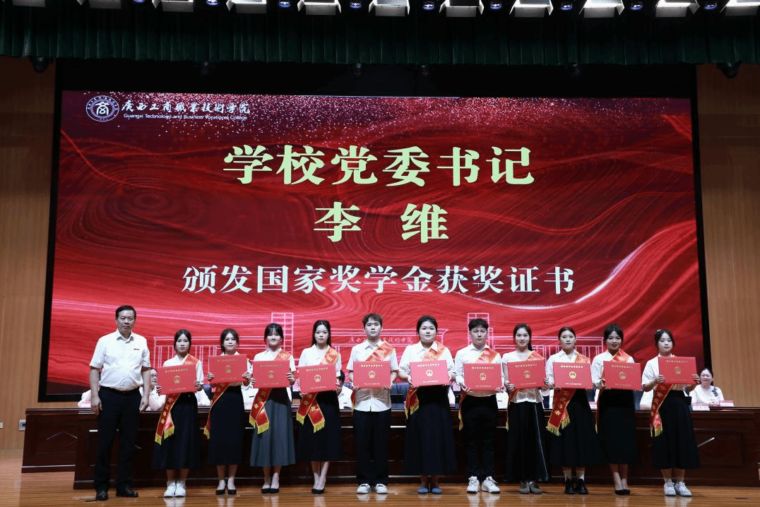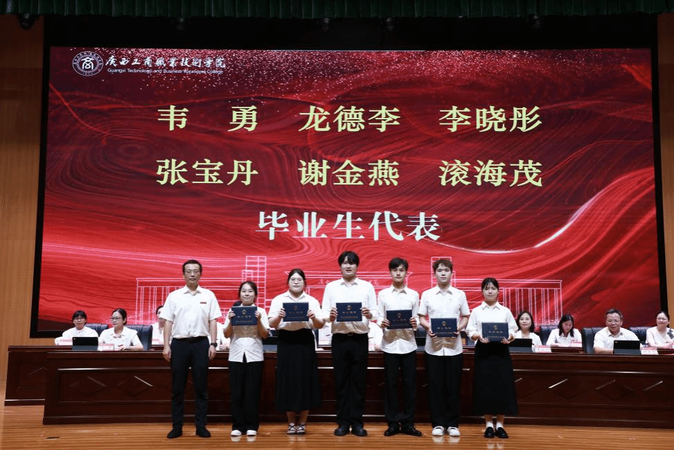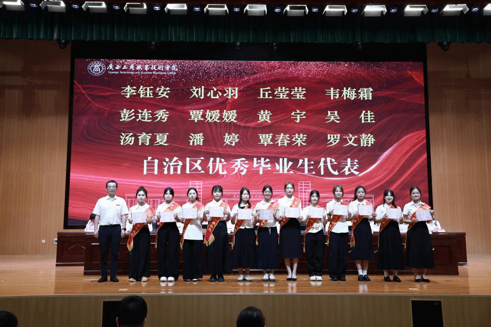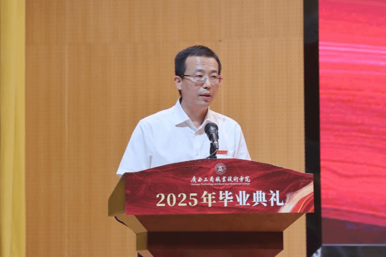 典礼上,阙勇平宣读2025年毕业生文件,韦云凤宣读优秀毕业生表彰文件,陈宁春宣读荣获国家奖学金优秀学生表彰文件。李维为国家奖学金获奖学生代表颁发荣誉证书,刘进为自治区级“优秀毕业生”代表颁发荣誉证书、为毕业生代表颁发毕业证书,韦云凤、陈宁春、阙勇平、郑华为校级“优秀毕业生”代表颁发荣誉证书。