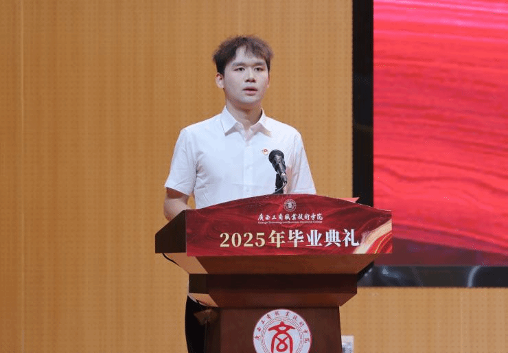 会计学院数会2220班韦勇作为毕业生代表发言,他表示,学校永远是我们最坚实的后盾,将带着校训赋予的勇气与担当,带着师长给予的温暖与力量,在学术的海洋中探索真知,在社会的舞台上发光发热。