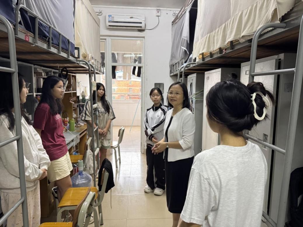 走访过程中,韦云凤深切关怀学生住宿安全及学习环境。她细致检查宿舍用电安全、消防通道与卫生状况,强调“宿舍是大家共同的家园,安全整洁至关重要”,叮嘱学生严守管理规定,严禁使用违规电器,确保居住环境安全舒适。同时,韦云凤特别关注学生学业进展与学习氛围营造,与同学们交流学习规划与困难,勉励大家科学制定学业目标,精进专业知识,善用图书馆等资源提升综合素养。她提出宿舍应成为互助共进的“学习型空间”,鼓励营造积极向上的学风,并嘱咐学生注重劳逸结合,保持身心健康。