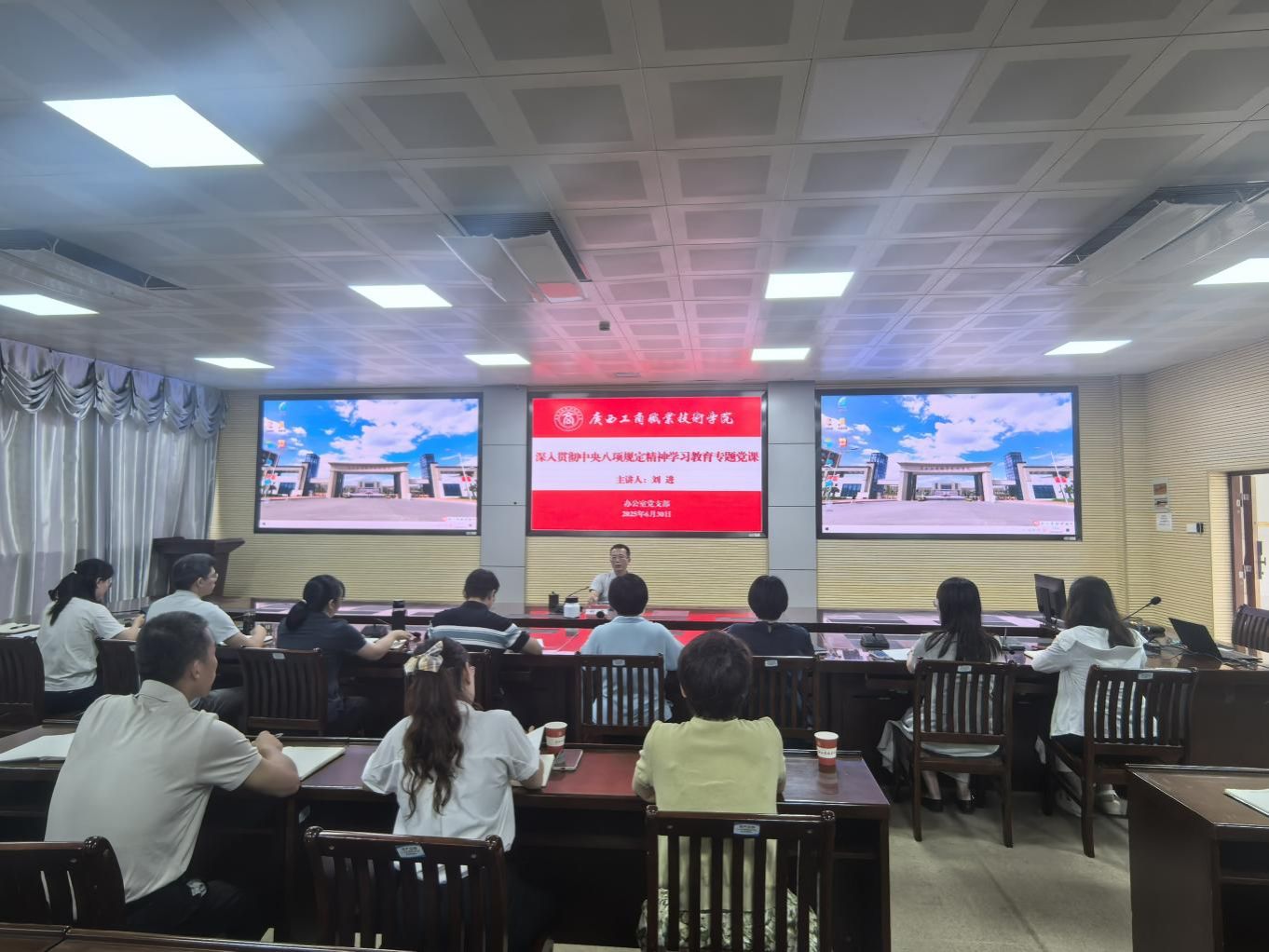 6月30日,学校党委副书记、校长刘进到基层党组织开展深入贯彻中央八项规定精神学习教育专题党课,学校办公室党支部全体党员参加活动。