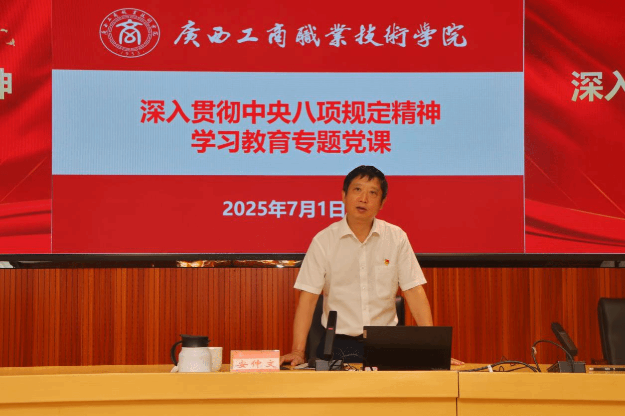 7月1日下午,学校党委副书记安仲文在鹏飞校区2145会议室,为分管部门及所联系学院的党员教师讲授学习教育专题党课。此次党课结合“七一”表彰大会后的重要时机,旨在进一步强化党员干部的纪律意识,推动中央八项规定精神入脑入心。