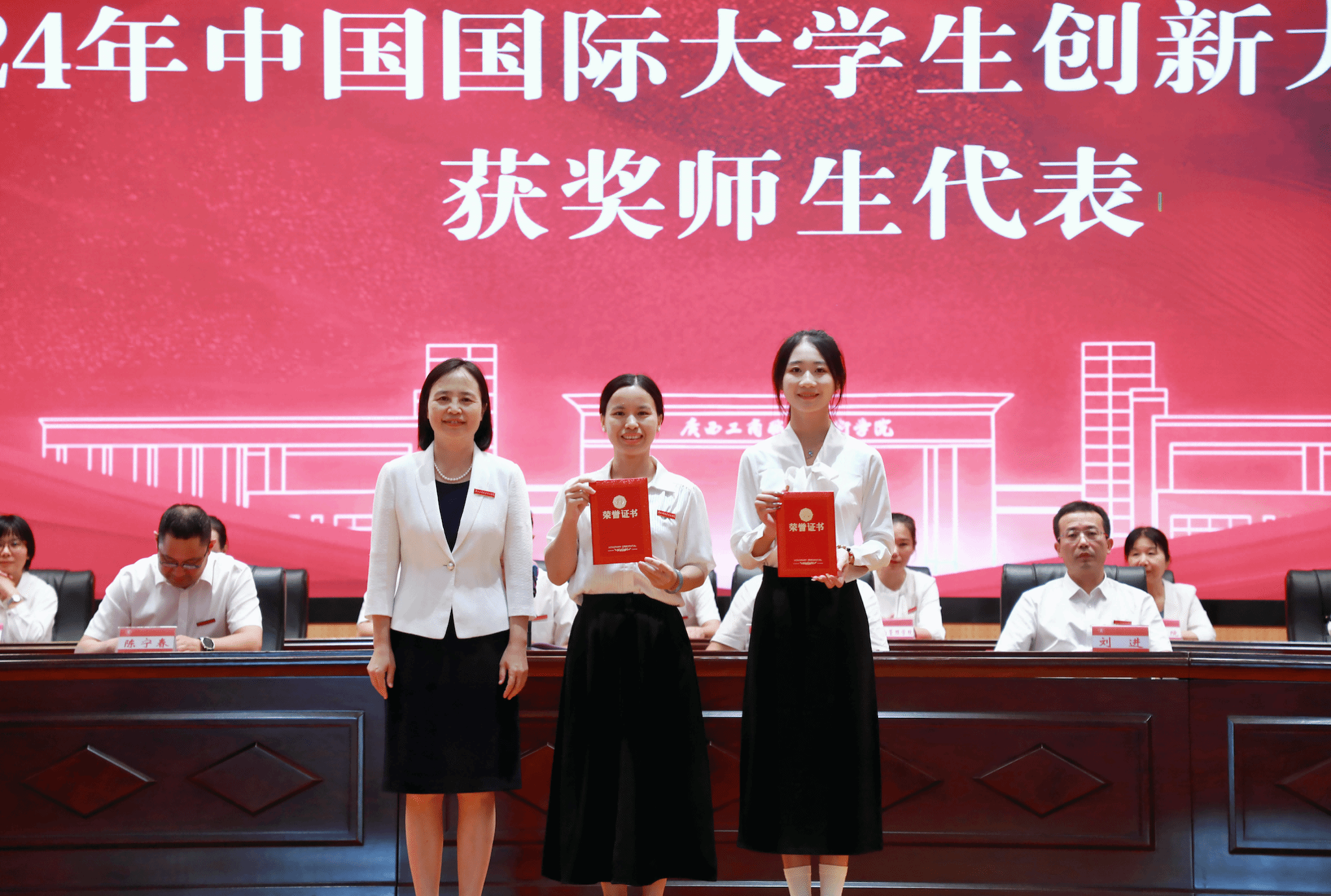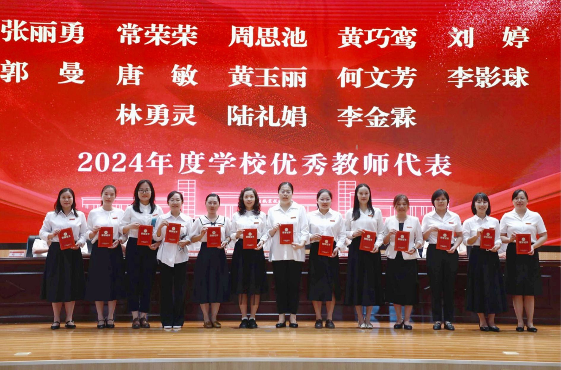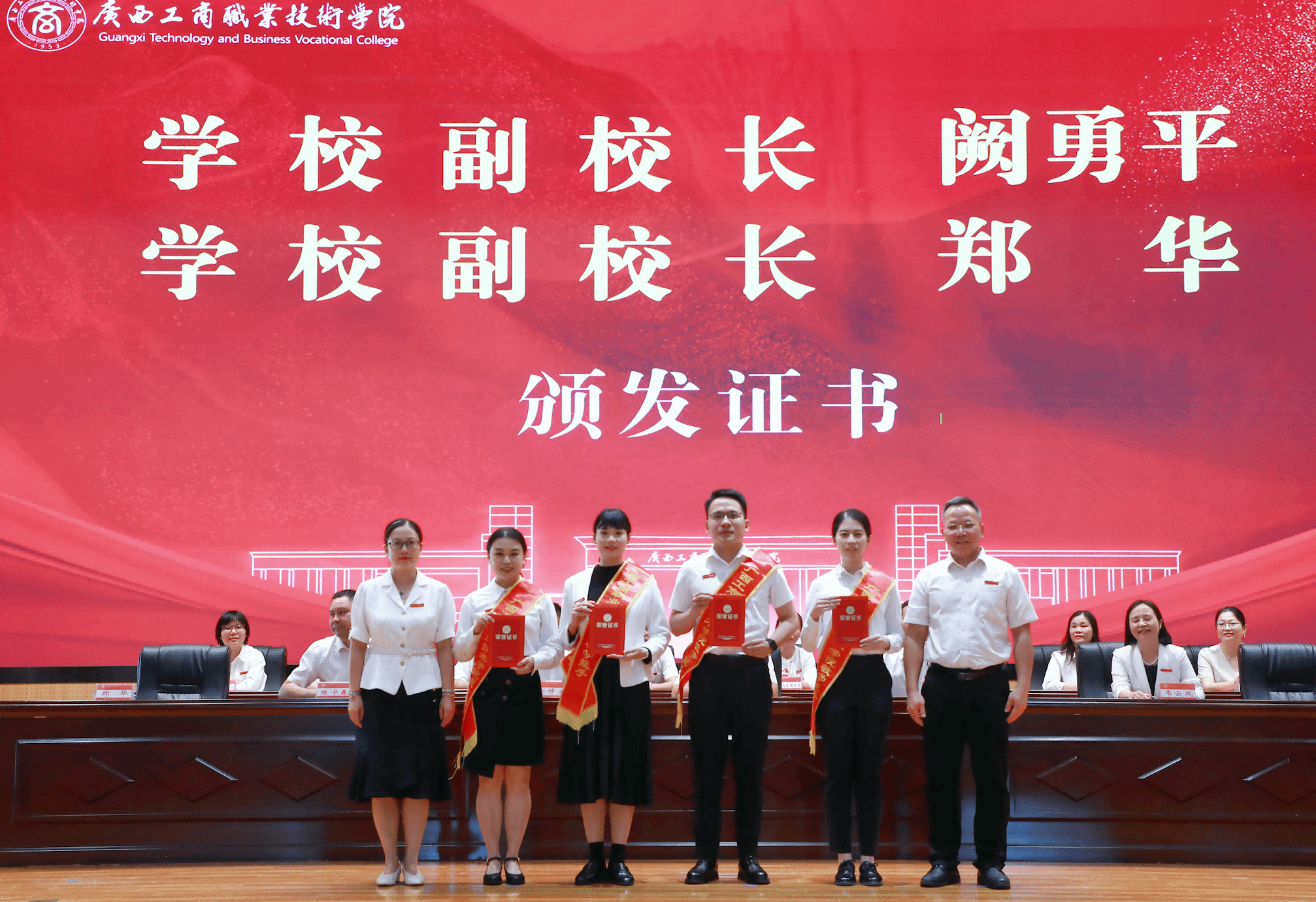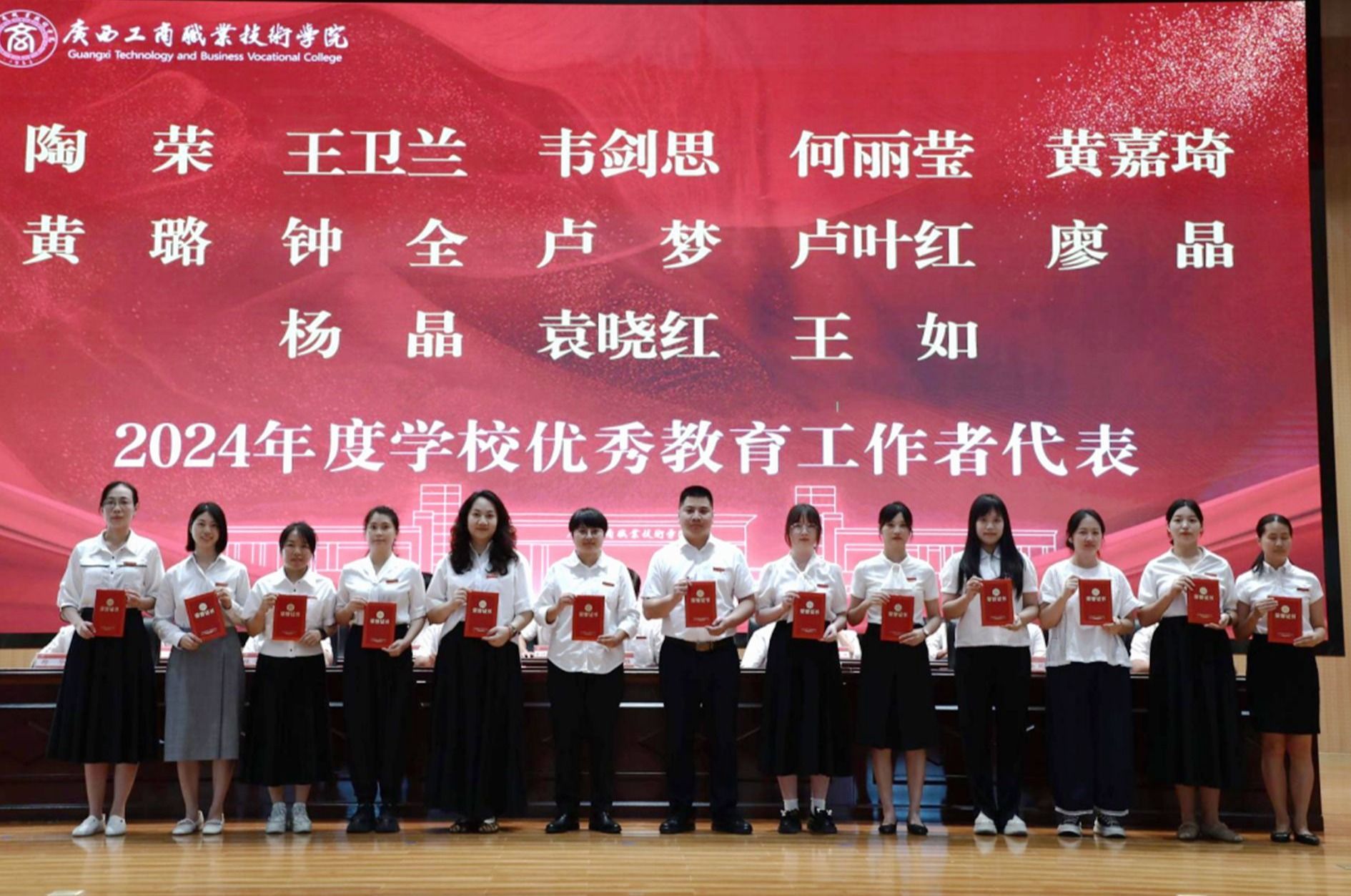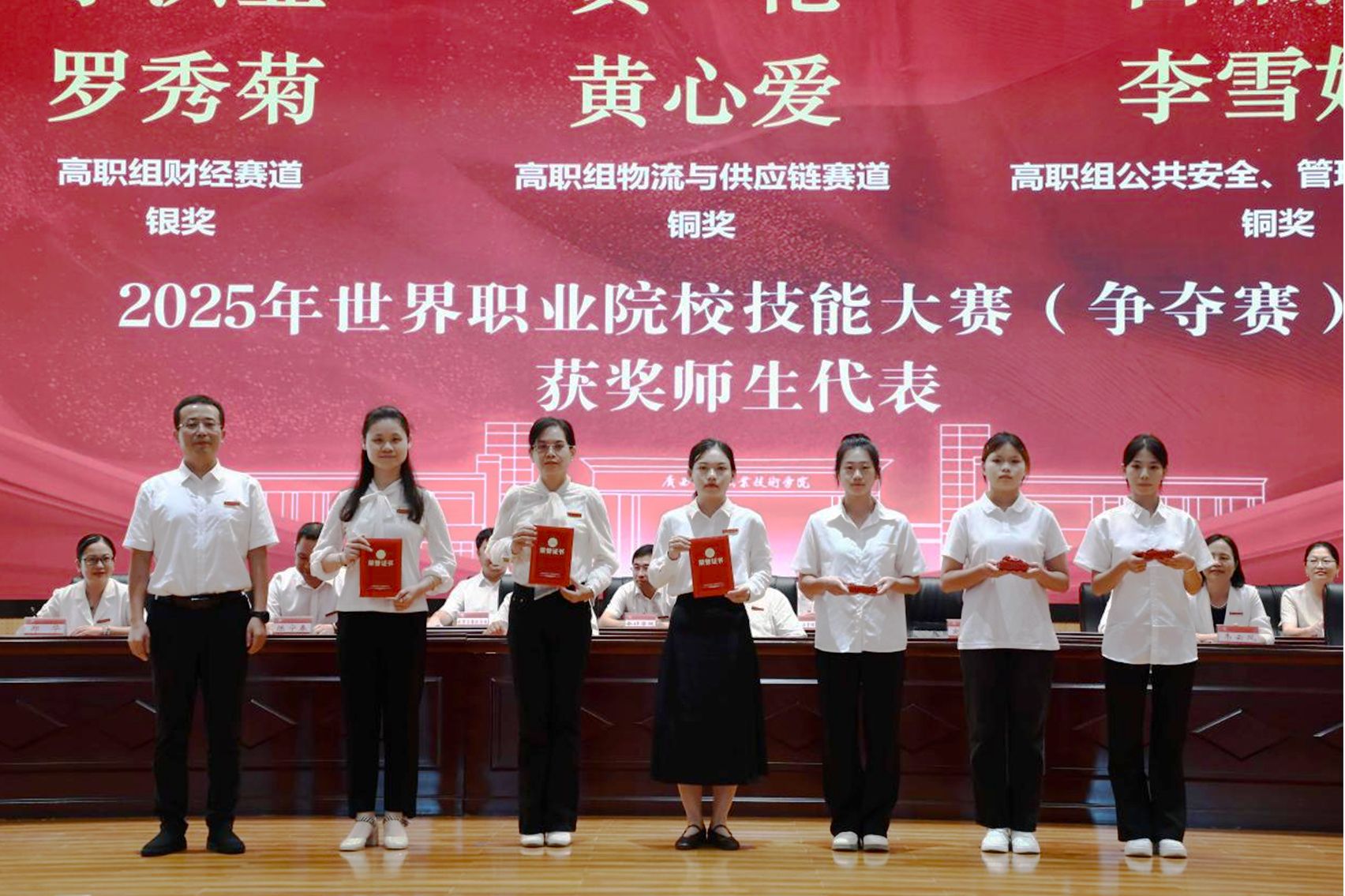 大会对学校2024年度学校优秀教师和优秀教育工作者代表、2025年度学校教学能手、2025年度学校教学名师、2024年中国国际大学生创新大赛获奖师生代表、2025年世界职业院校技能大赛(争夺赛)获奖师生代表、2024年度广西技术能手进行了表彰。